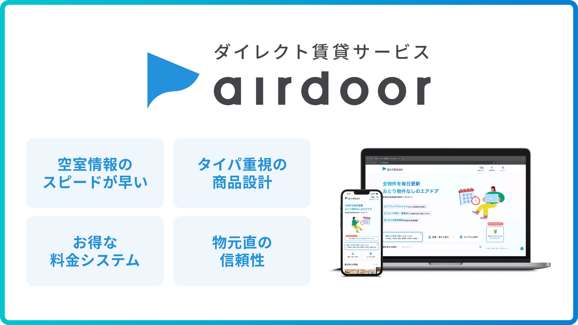 エアドアは、「不動産事業者とカスタマーにフラットな取引の場をつくる」をビジョンに、2022年2月より、管理会社のデータベースの情報を直接掲載しリアルタイムでお部屋探しができる賃貸プラットフォーム「エアドア」を提供しています。