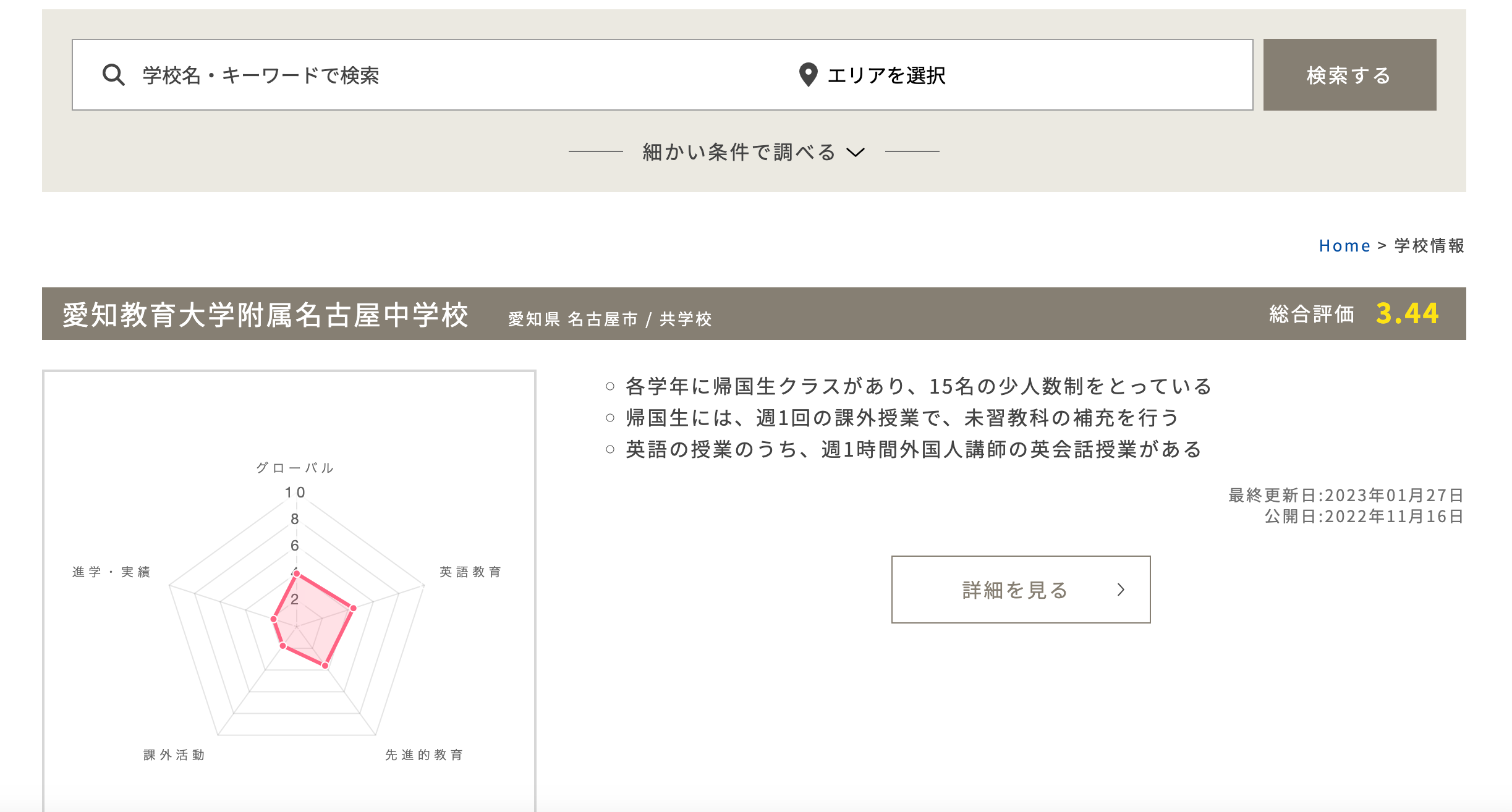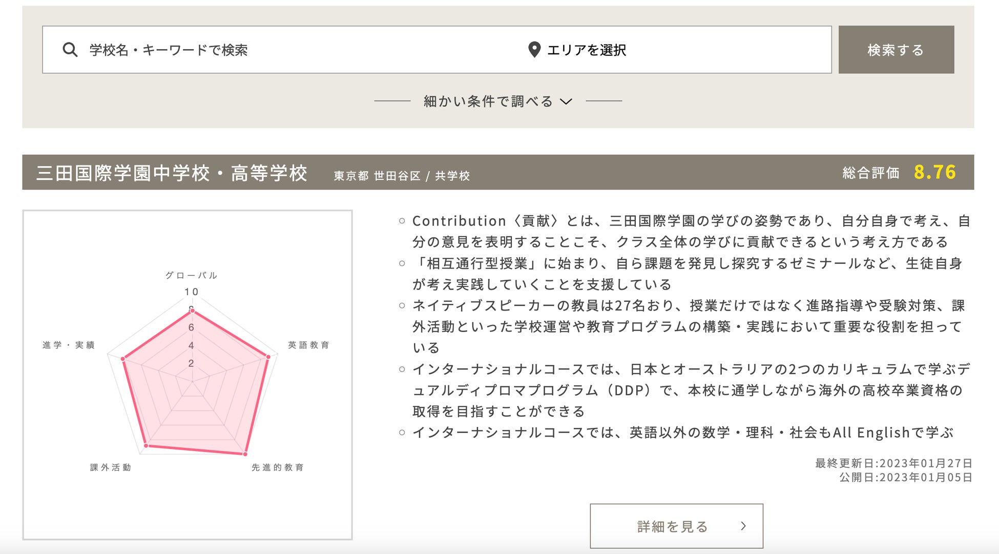 G School Naviでは、上記のように学校名やエリアで検索すると、5つの指標から学校の評価を確認できます▲