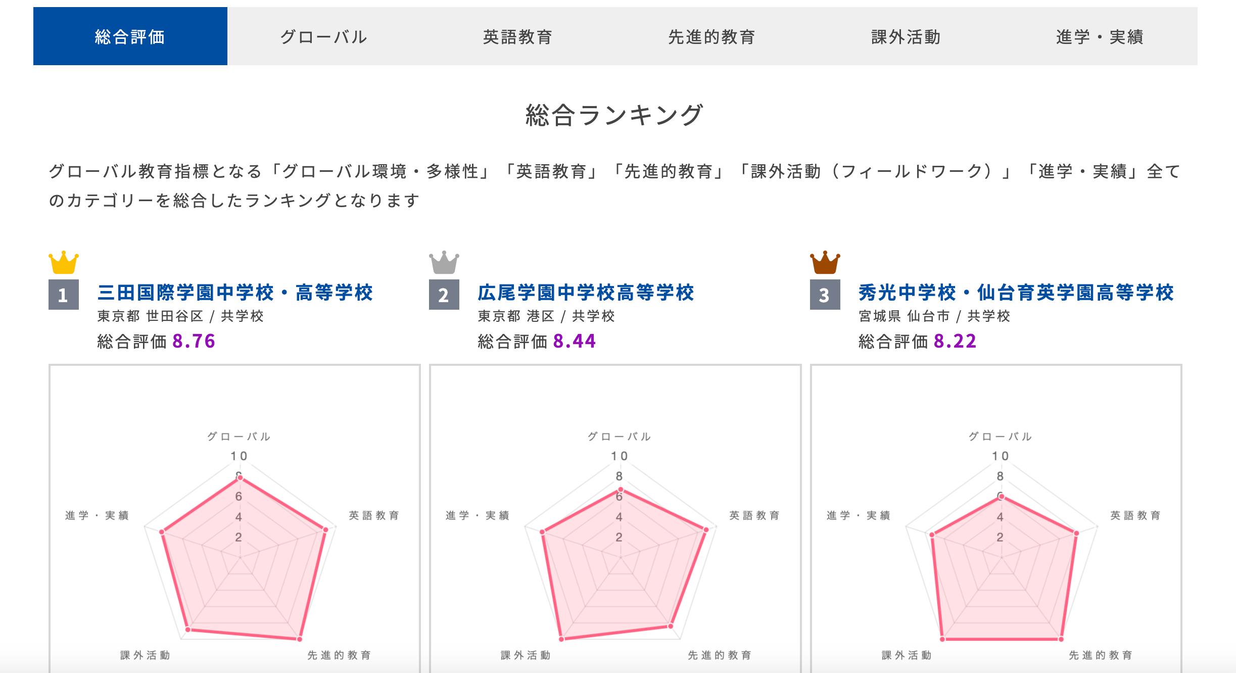 また、総合評価だけでなく、グローバルや英語教育などの各指標ごとにランキングを確認できます。