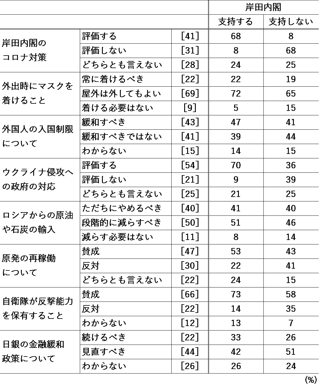 表中のカラムの一番目、岸田内閣のコロナ対策については、「(内閣を)支持する」と答えた人たちは「評価する」=68% 、「評価しない」=8%、「支持しない」と回答した人たちは「評価する」=8% 、「評価しない」=68%と正反対で、コロナ対策評価が内閣の支持・不支持を区分する要素になっていることがわかります。四番目のウクライナ侵攻への政府の対応に関しても、内閣支持派の「評価する」が70%であるのに対して、内閣不支持派の「評価する」は36%と顕著な相違が存在しています。