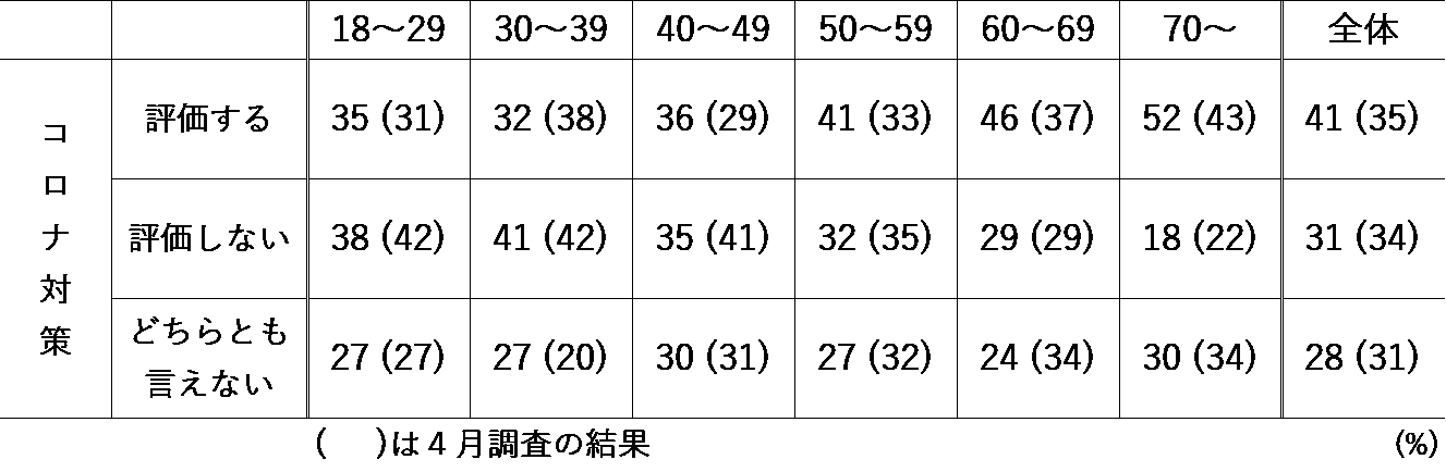 次に【表2】をご覧ください。岸田政権の新型コロナ対策の評価を年齢別にまとめました。表中( )内の数値は4月調査の結果に相当します。70歳以上の最高齢層をはじめとして、中高年層で「評価する」比率が上昇し、「評価する」>「評価しない」が明確に読み取れるでしょう。他方、18~29歳、および30代の若年層においては、逆の傾向、つまり「評価しない」>「評価する」が続いています。「評価する」=「若低-老高」、「評価しない」=「若高-老低」という、内閣支持・不支持と相似形の構造にほかなりません。