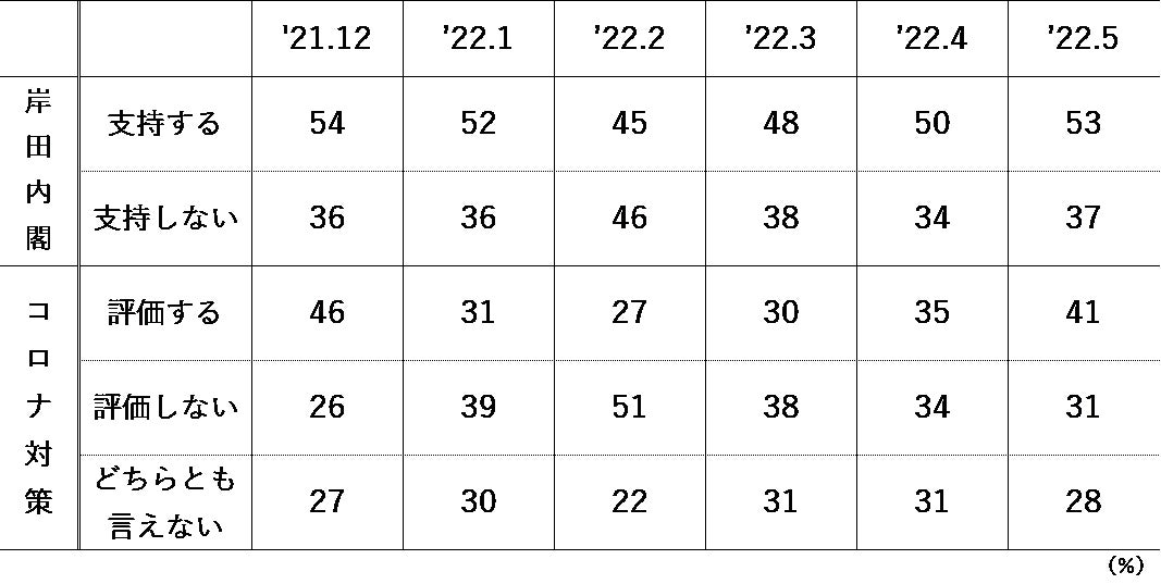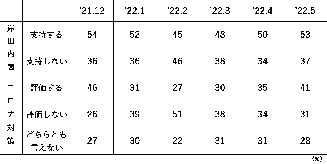 【表1】は、岸田内閣の支持・不支持と、政府のコロナ対策への評価について、推移をまとめたものです。コロナ対策を「評価する」は4ポイント増えて41%、「評価しない」は3ポイント減の31%で、「評価する」-「評価しない」間の差は、4月の1ポイントから10ポイントと二ケタに広がりました。岸田政権は、引き続き安定軌道上にあると言えるでしょう。