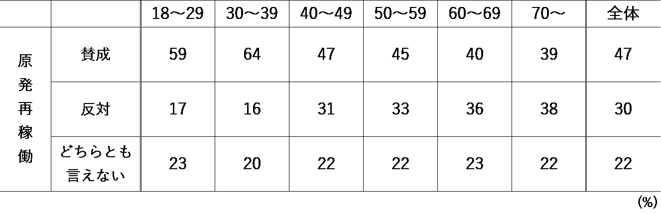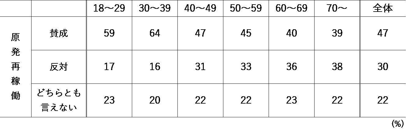 さて、今月(5月)の調査で採用したトピック質問の結果の中で、年齢差が存在したのが「原発の再稼働を進めること」への賛否でした。〔表3〕がそのまとめです。