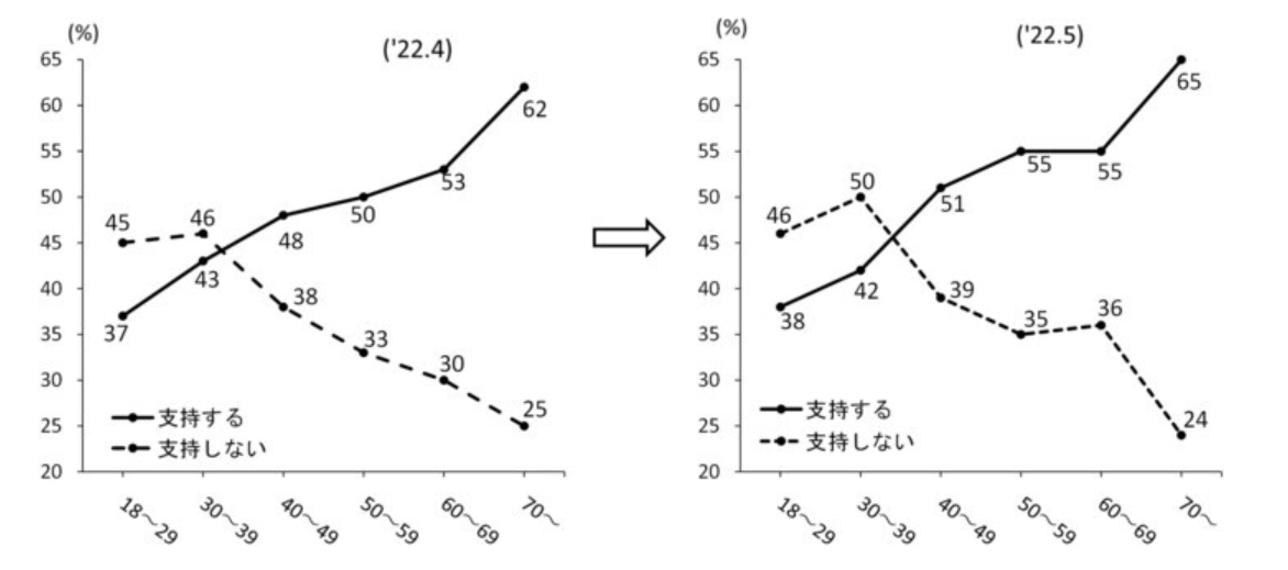 しかも、18~29歳、30代の若年層では、不支持が支持を上回っています。40代以上の中高年層では、4月から5月にかけて支持率の上昇がみられるにもかかわらず、若年層においては支持率が低迷したままで、かえって不支持率が増加しています。