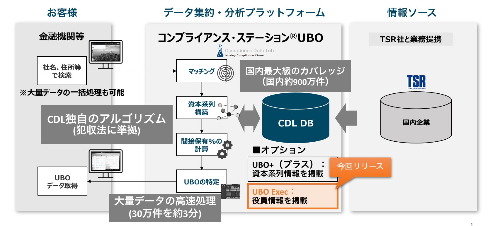 コンプライアンスソリューションを提供するコンプライアンス・データラボ株式会社(本 社:東京都千代田区、代表取締役:山崎博史、以下 CDL)は、犯罪収益移転防止法(犯収法*1)に準拠した、企業の実質的支配者(UBO)情報*2 と企業概要に加えて、当該企業の「役員情報」をオンラインで瞬時に提供するシステム「コンプライアンス・ステーション®️UBO Exec(エグゼック)」を2024年3月22日(金)にリリースします。