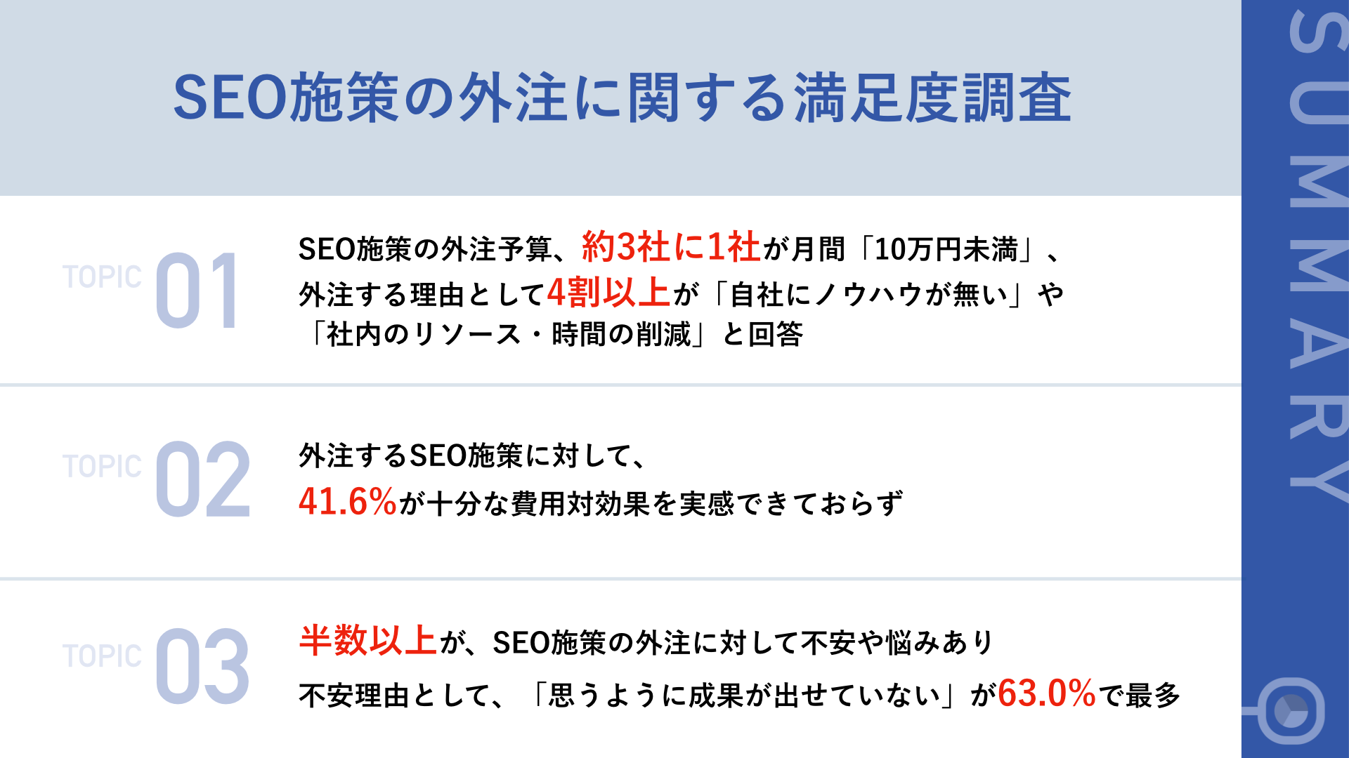企業のSEO施策において専門性が高いために、外注は必要コストであると考えられている一方で、専門性が高いがゆえに外注の費用対効果が明確ではない悩みを多くの経営者が抱えていることが分かりました。具体的な悩みとして、思うように成果が出ていないことはもちろん、なぜ成果が出ないのかが分からないという「施策内容のブラックボックス化」が多い結果となりました。ただ外注先を変えることや外注費用を見直すよりも、まずは今の施策に対する不足点・改善点を見出すために、サードパーティーへ自社サイトの分析を依頼することが有効なのではないでしょうか。
