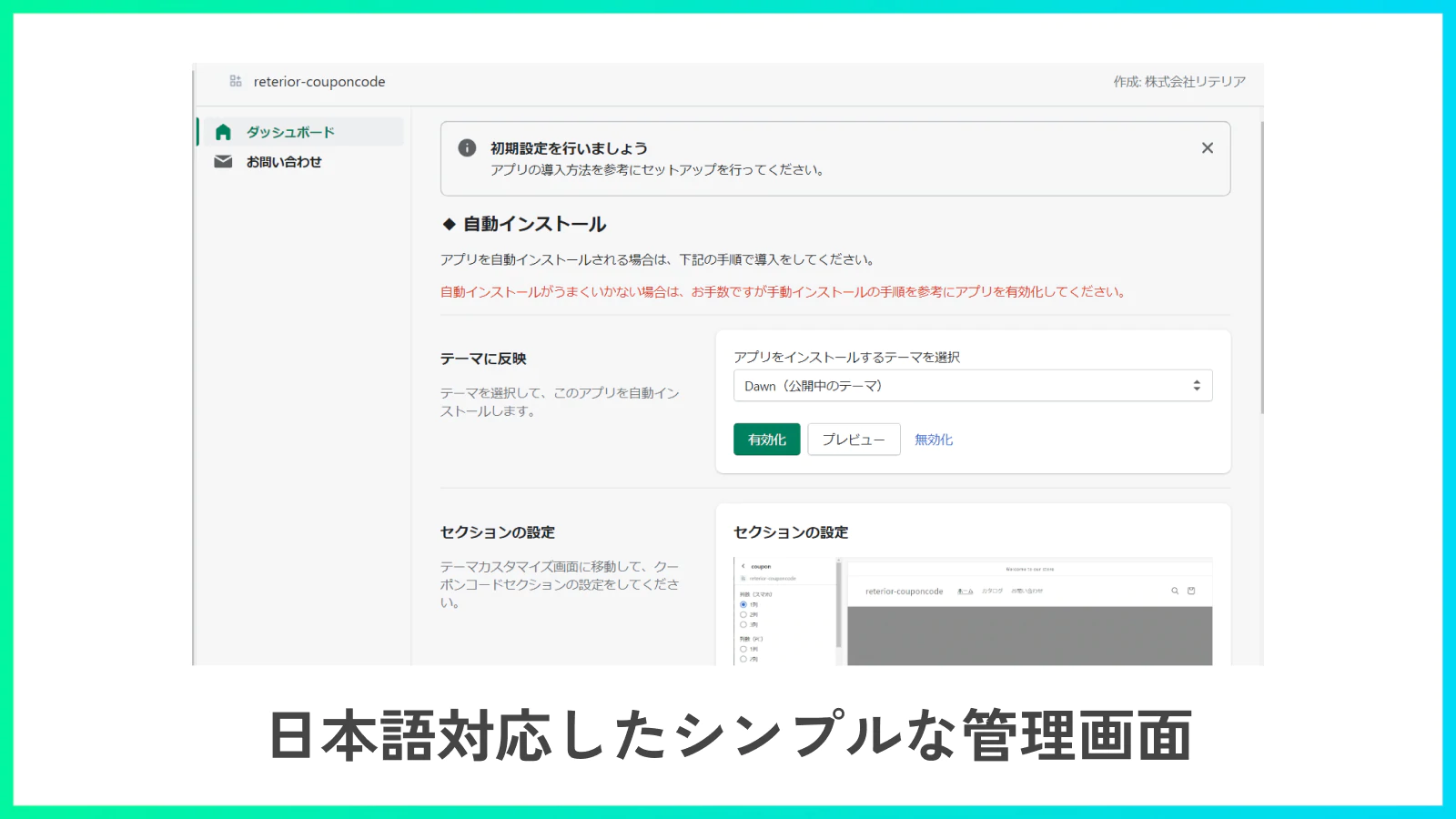 「クーポンコード 1クリック コピー|リテリア Coupon」は、日本製のShopifyアプリです。日本語に対応したシンプルな管理画面であるため、簡単にShopifyアプリを導入することができます。