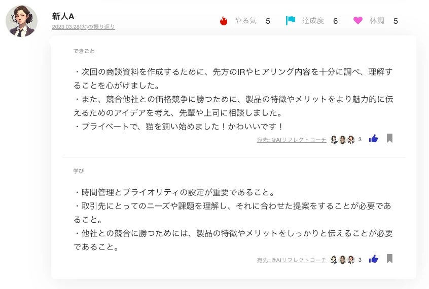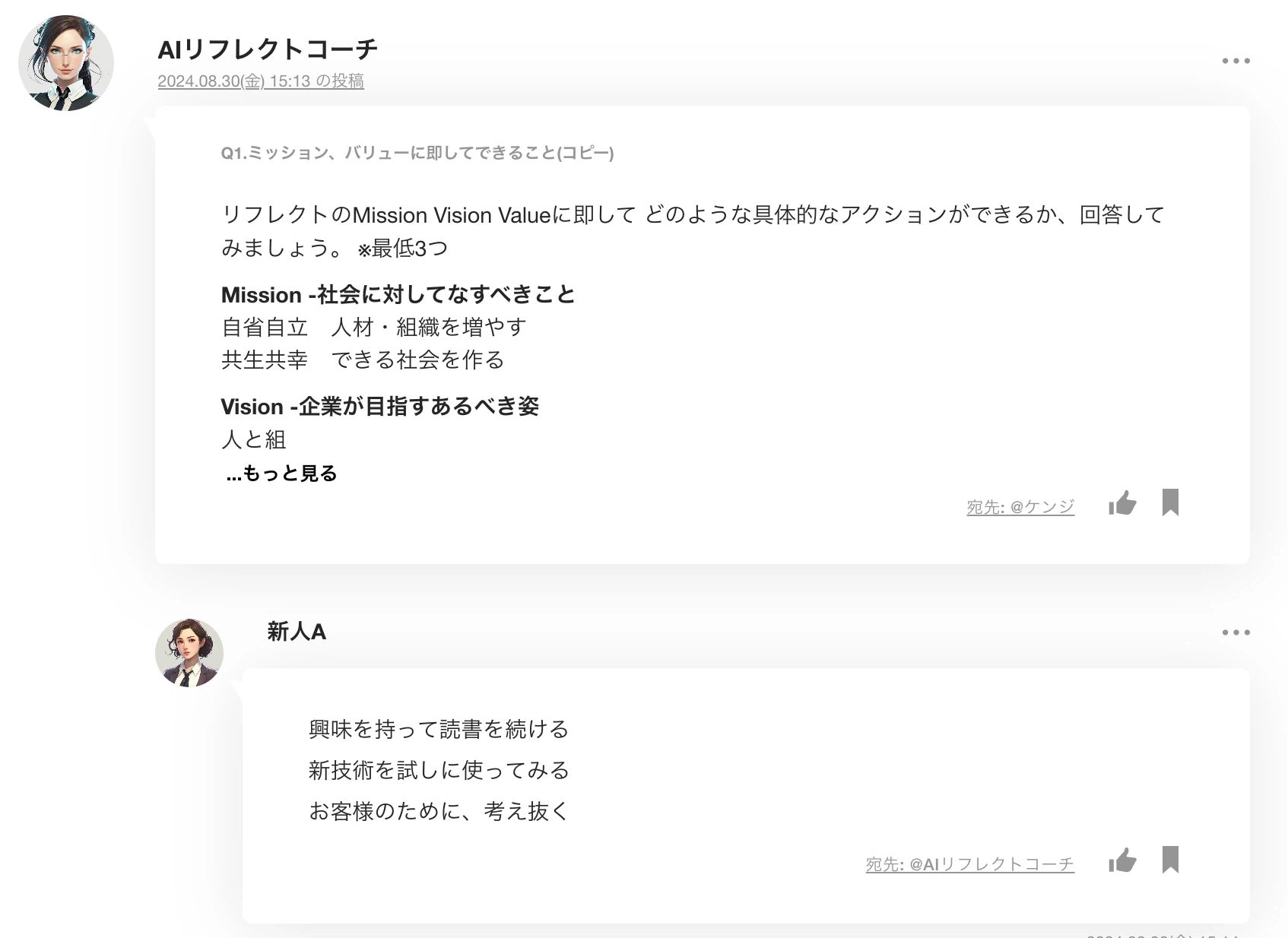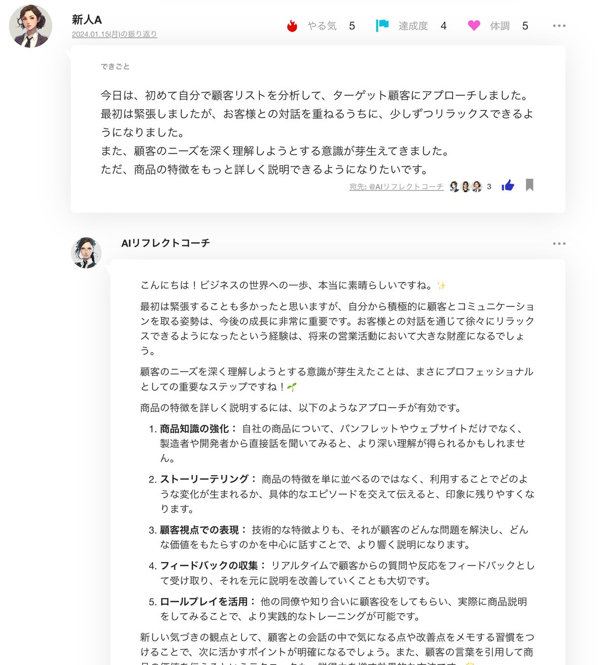 文化浸透:Mission Vision Valueに対しての行動計画をAIが投げかけたり、Reflect上でチームや他部署の同期と日々の振り返りを共有することで、部署を越えた学び合い・励まし合いが生まれます。新人は自部署以外でどのような業務や工夫が行われているか知ることができ、会社全体のビジョンやカルチャーへの理解を深めます。AIコーチが新人の行動を客観評価し、「***なアプローチですね」など企業の価値観に絡めたフィードバックを返すことで、新人に企業文化を意識させ定着させる効果も期待できます。