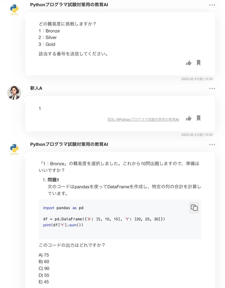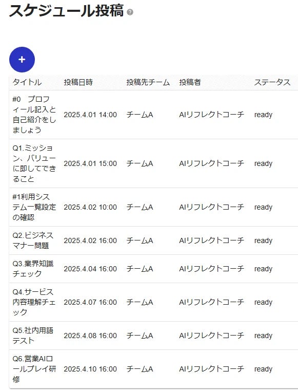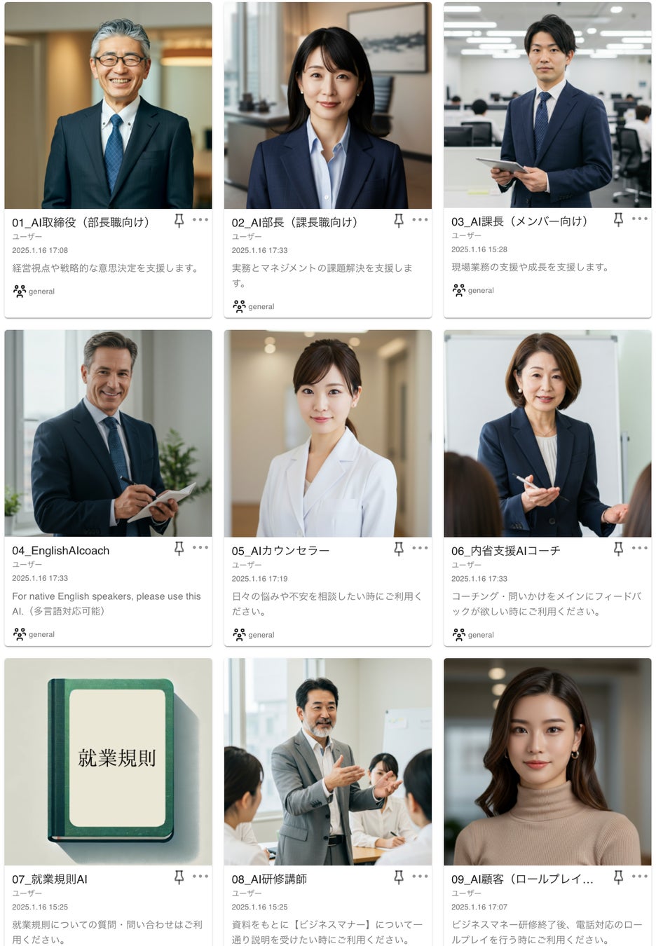 研修期間:研修スケジュール通りに、各AIエージェントが研修(ビジネスマナー、業界知識等)やテストを行います。難易度に応じた研修・テストを行うことや自社の専門知識をもとにした課題を出題することも可能です。