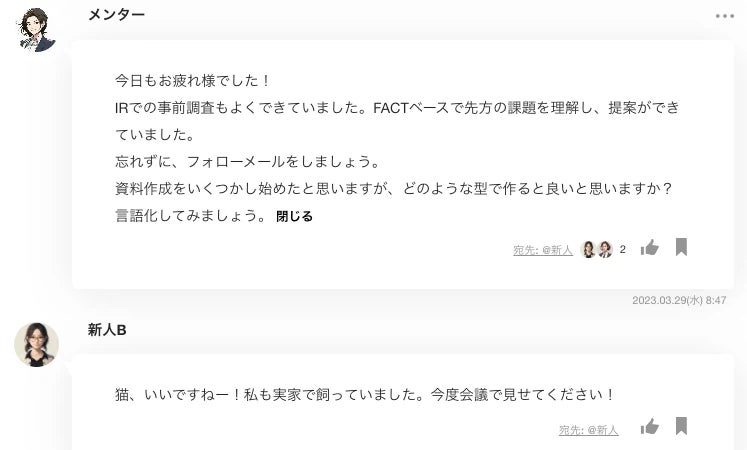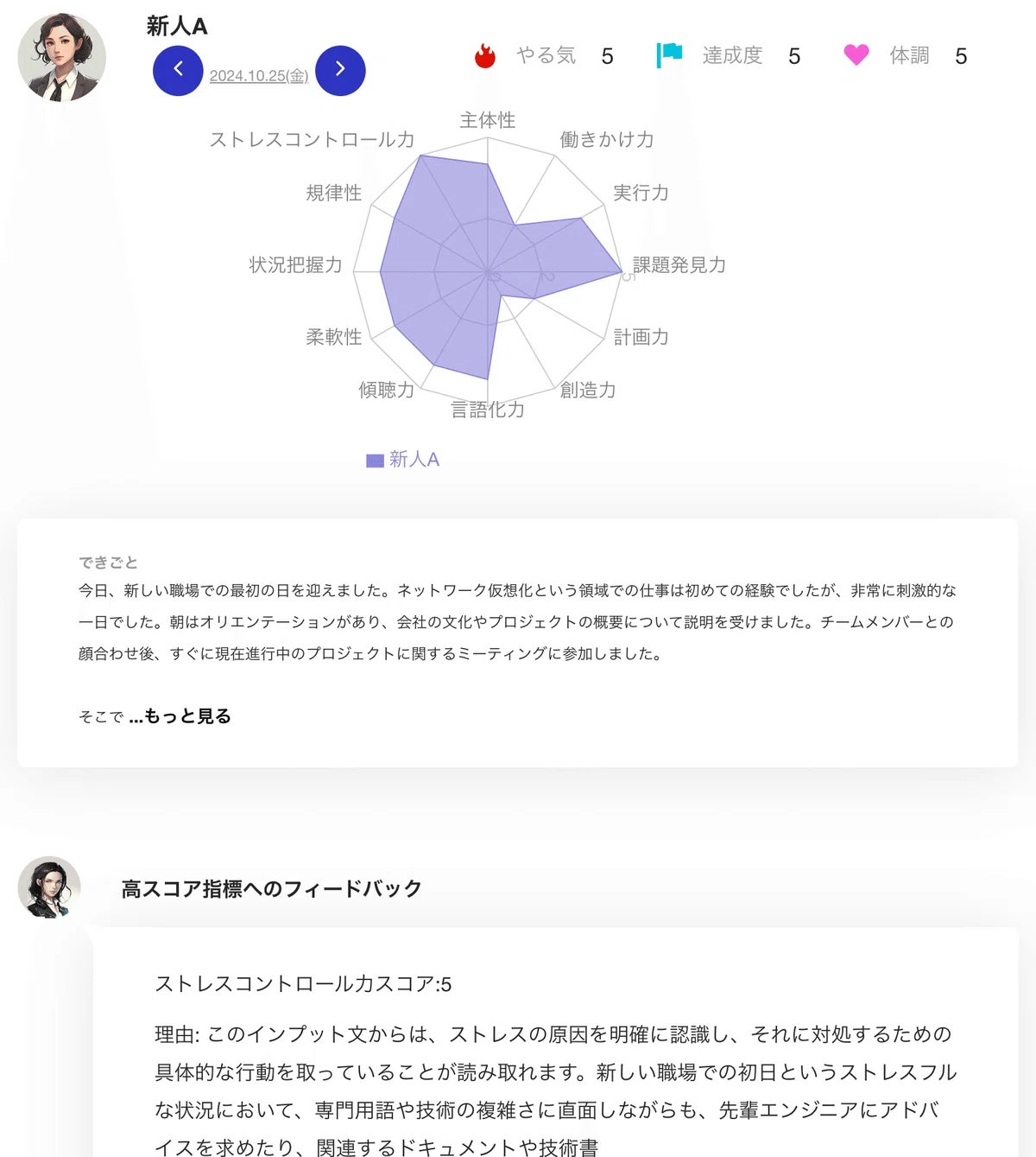 また、新入社員一人ひとりにAIコーチやAI上司が寄り添い、研修内容に応じた毎日の振り返り(日報)に対して即座にポジティブなフィードバックや改善提案を提供します。これにより振り返りが「面倒な作業」から「成長の実感が得られる機会」へと変わり、主体的な学習意欲を引き出します。新人からの「もっと効率よく進めるには?」といった問いにもリアルタイムで答えるため、疑問やつまずきを翌日以降に持ち越しません。