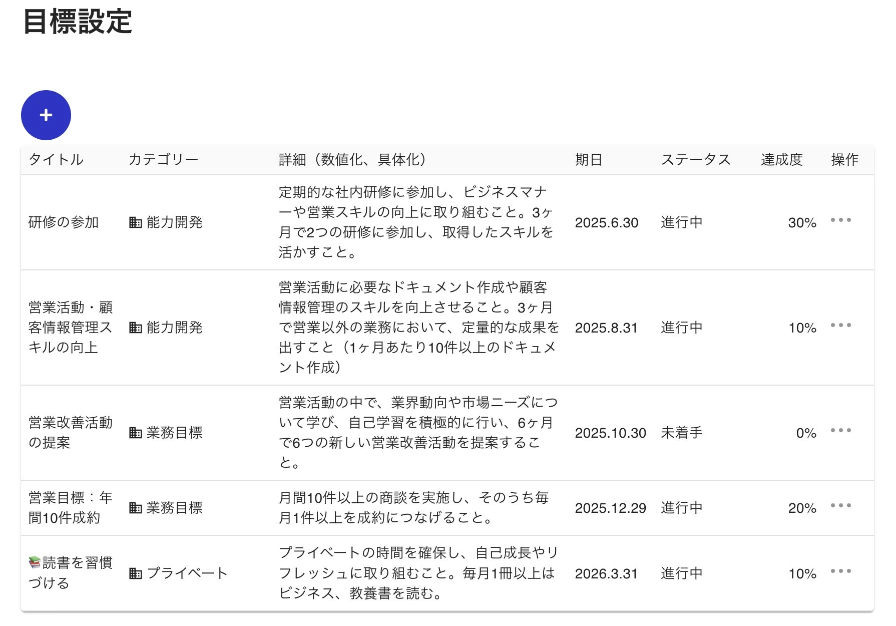フィードバック:AIが目標達成に向けて、フィードバックをし続けたり、目標達成のプロセスである日報・週報などに対して、アドバイス、問いかけ、評価のフィードバックをします。
