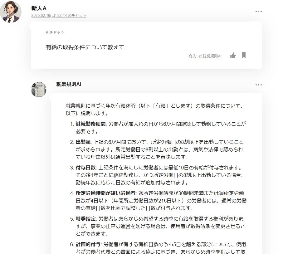 初日対応:チャットボット型のAIエージェントが24時間体制で質問に回答。入社初日に生じがちな疑問(社内手続きや設備の使い方等)を即座に解消し、新人の不安を取り除きます。FAQ対応の自動化により人事担当者の負荷も軽減します。