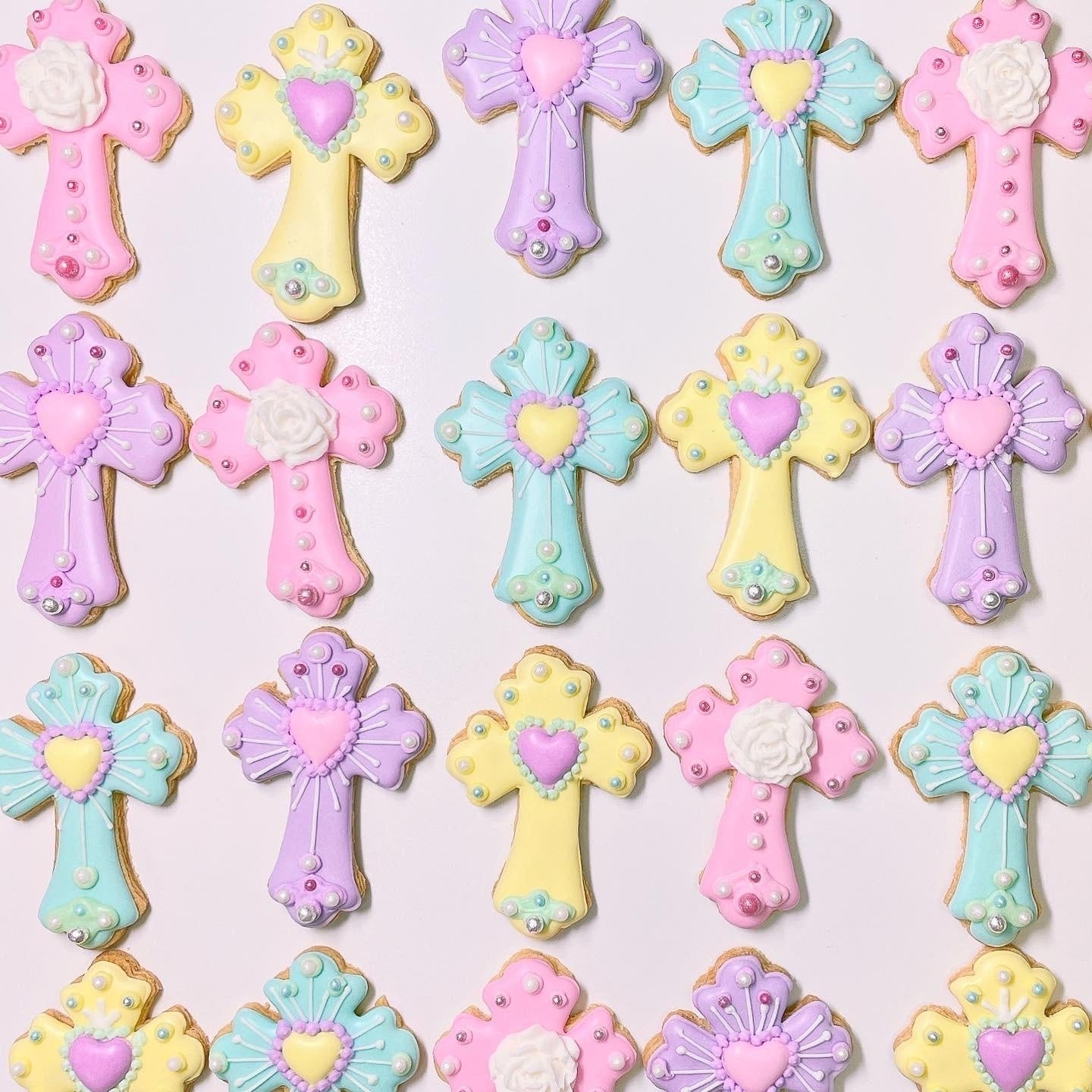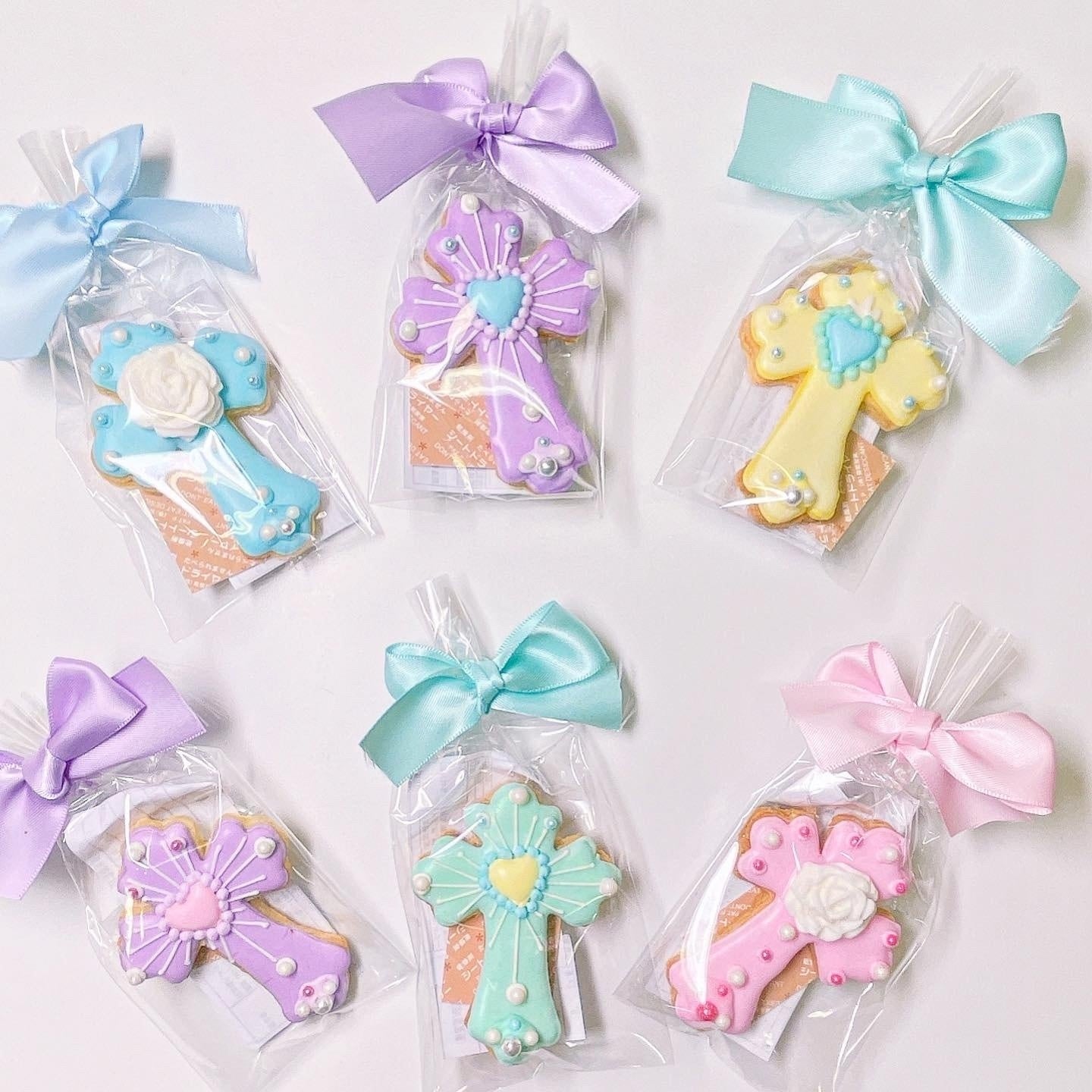 アイシングクッキーを超えた、食べられるアートクッキーをお届けしているストア。鮮やかなパステルカラーの十字架クッキーは細部まで凝った可愛らしいデザインです。