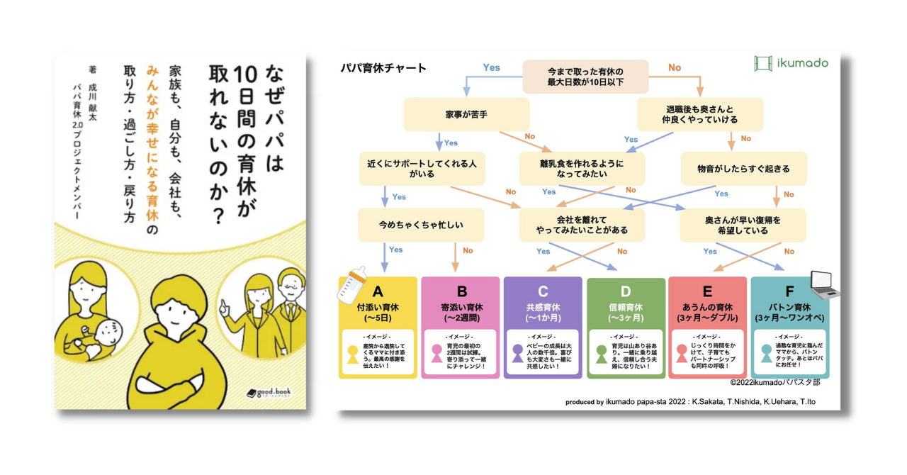これまでikumadoでは、『なぜパパは10日間の育休が取れないのか?』の書籍出版や、男性育休取得経験者を中心に構成される「ikumadoパパスタ部(パパをスタートする部)」を主体に、イベントや座談会など、男性の育休取得に関する様々な活動を行ってきました。また、「どんな人も自由に育休の期間を決められる社会」を目指したいという思いから、パートナーや職場でパパ育休を考えている方々が気軽に育休を考えるきっかけにと『パパ育休チャート』を作成しました。