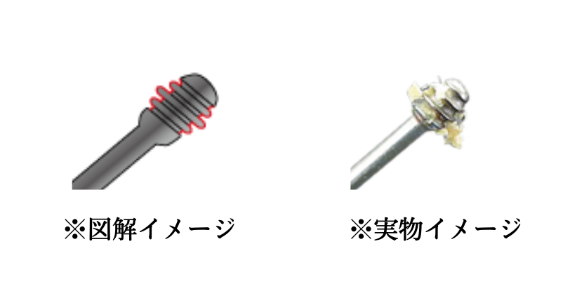 先端は大小起伏が付いたネジの形状(ラグビーボール形状)になっており、緻密に計算されたサイズにすることで、奥まで入ります。