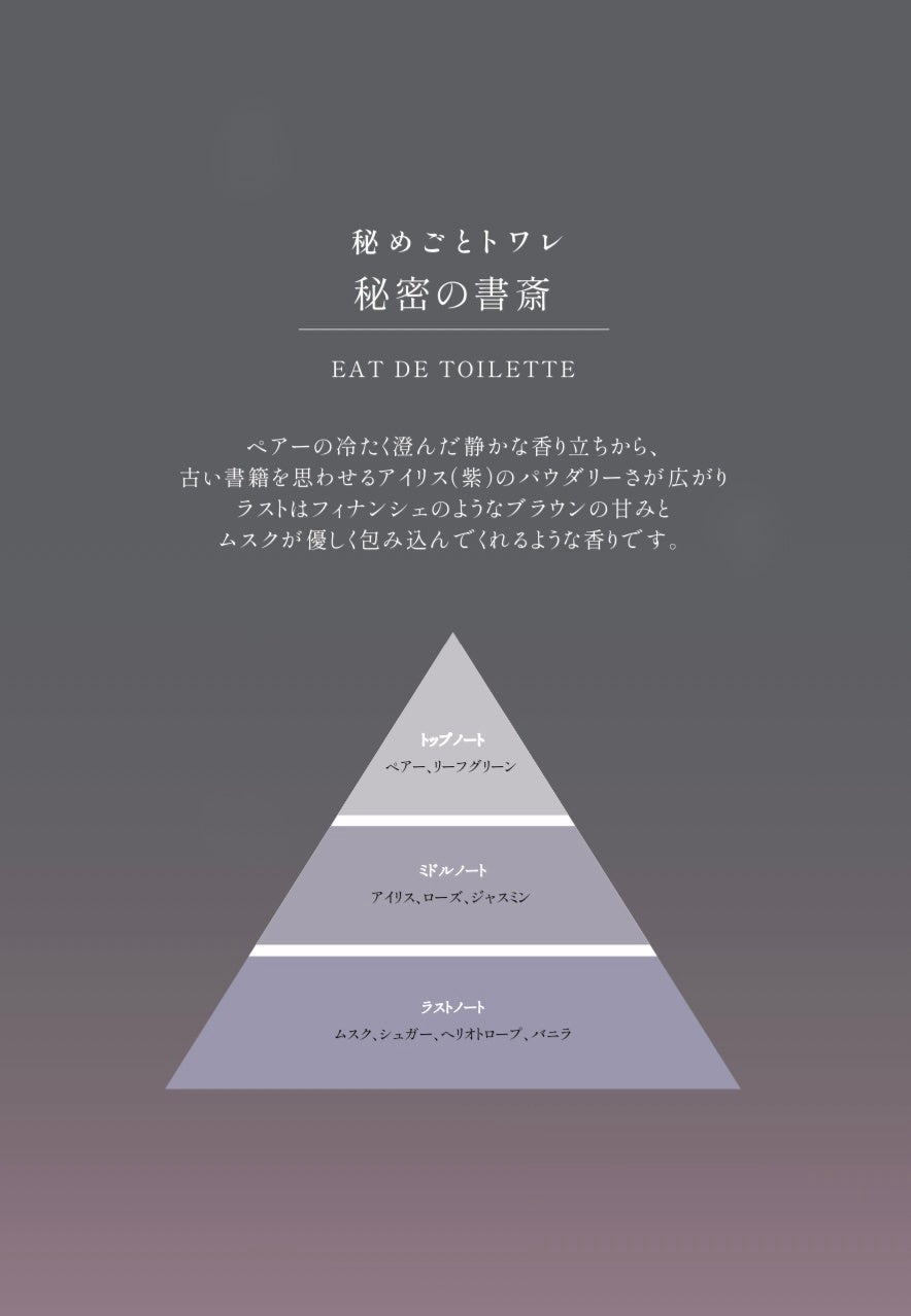 爽やかなグリーンリーフ、ペアーの冷たく澄んだ香り立ちから、アイリスのパウダリーな香りが広がり、ラストはフィナンシェのようなブラウンの甘みとムスクが優しく包みこんでくれる、どこか懐かしい書斎を思わせるような香りです。
