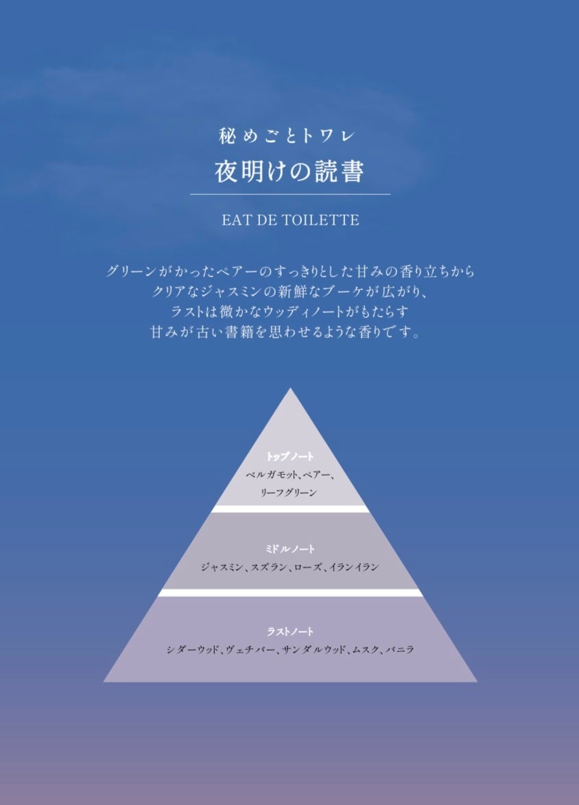 夜明けの澄んだ空をイメージした、グリーンがかったペアーのすっきりとした香り立ちから、クリアなジャスミンの新鮮なブーケが広がり、ラストはほのかなウッディノートがもたらす甘みが、古い書籍を思わせるような香りです。