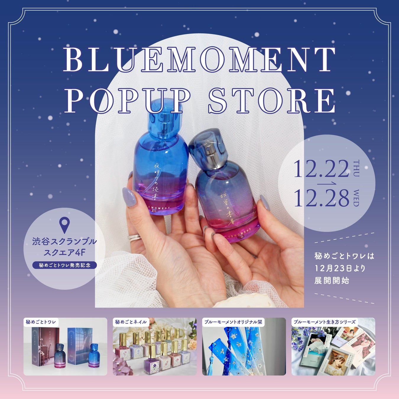 ・STORE展開商品:「秘めごとトワレ」2種、「秘めごとネイル」9種、ブルーモーメント生き方シリーズ5冊、ブック雑貨2種