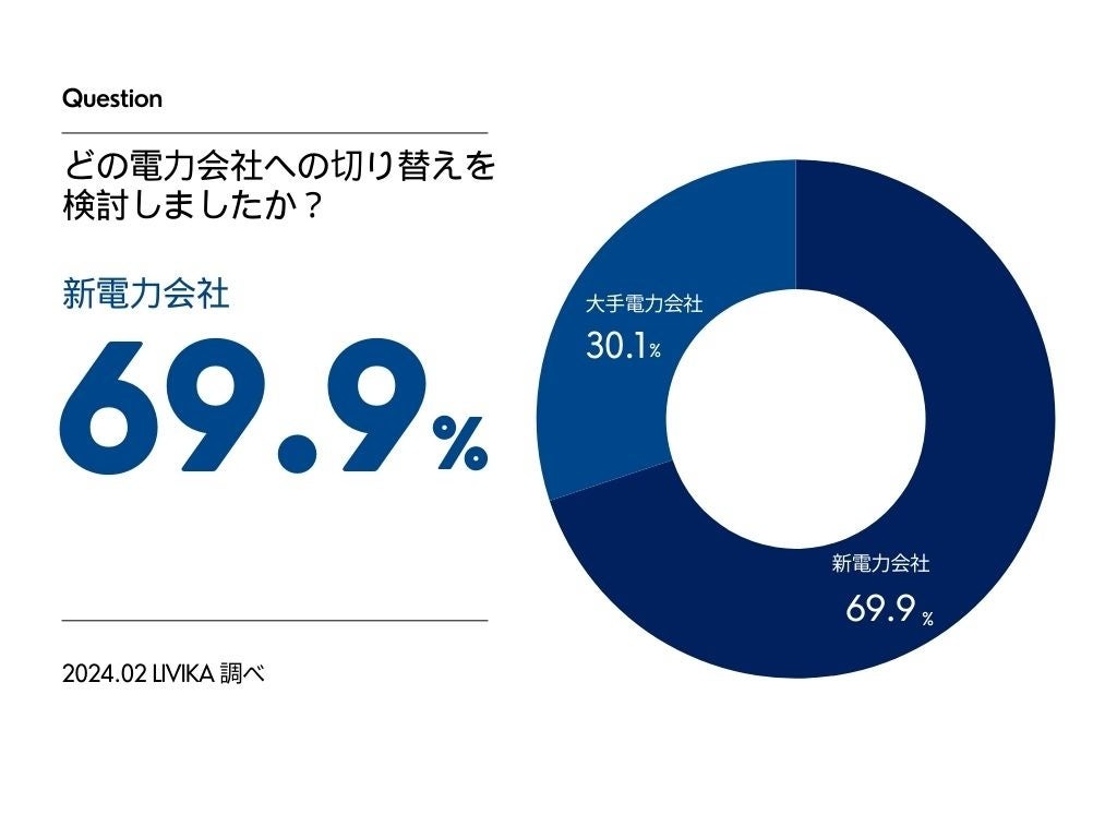 「検討する」と回答された方々にどの電力会社へ切り替えしたか調査した結果、切り替え先の選択について約70%が新電力を検討されたことが明らかとなりました。
