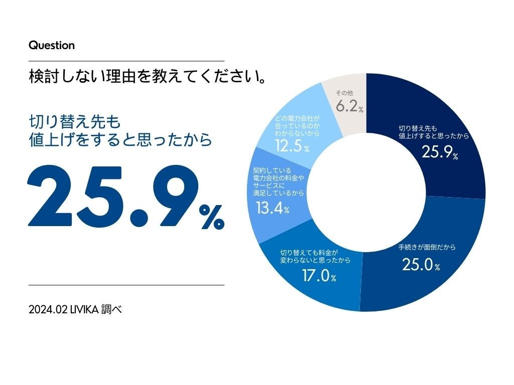 その結果、「切り替え先も値上げすると思ったから」が25.9%、「手続きが面倒だから」が25.0%、「切り替えても料金が変わらないと思ったから」が17.0%という結果が得られました。