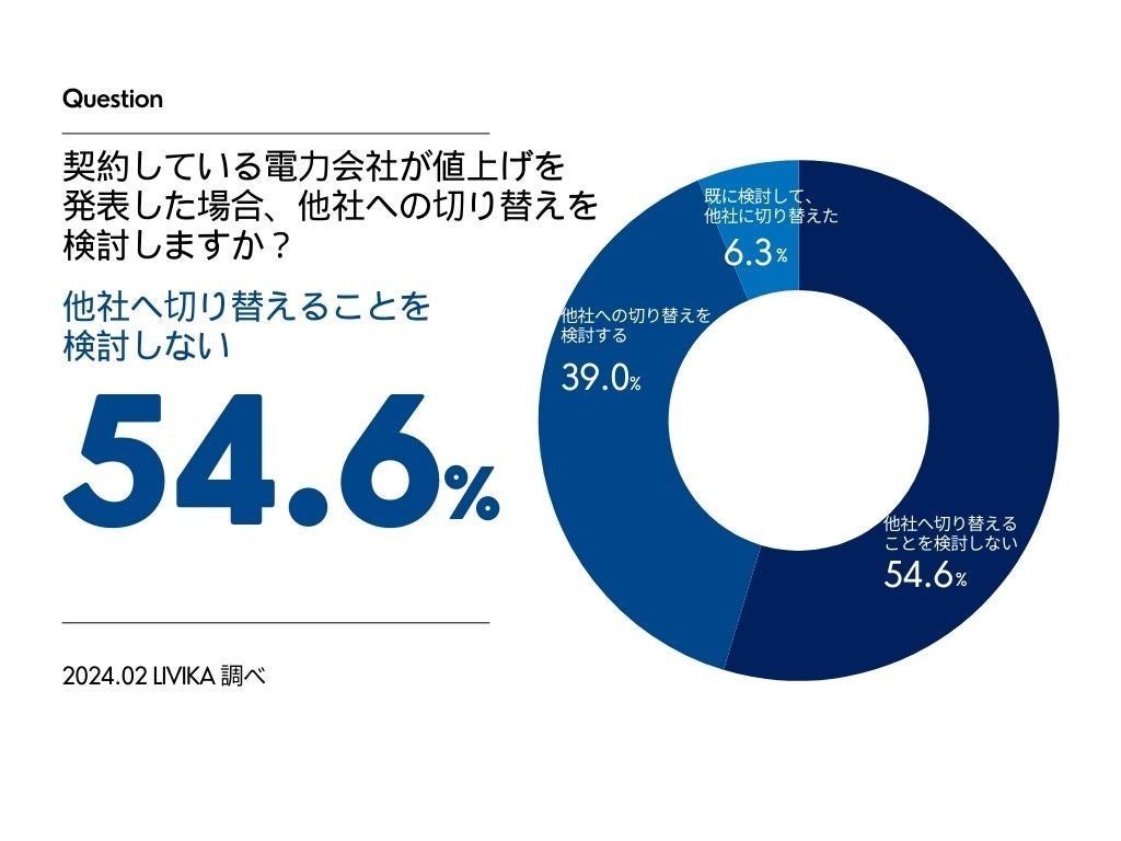 多くの方々が電気代の値上げに不安や危機感を抱いていますが、驚くべきことに、回答者の54.6%が「他社への切り替えを検討しない」と答えました。