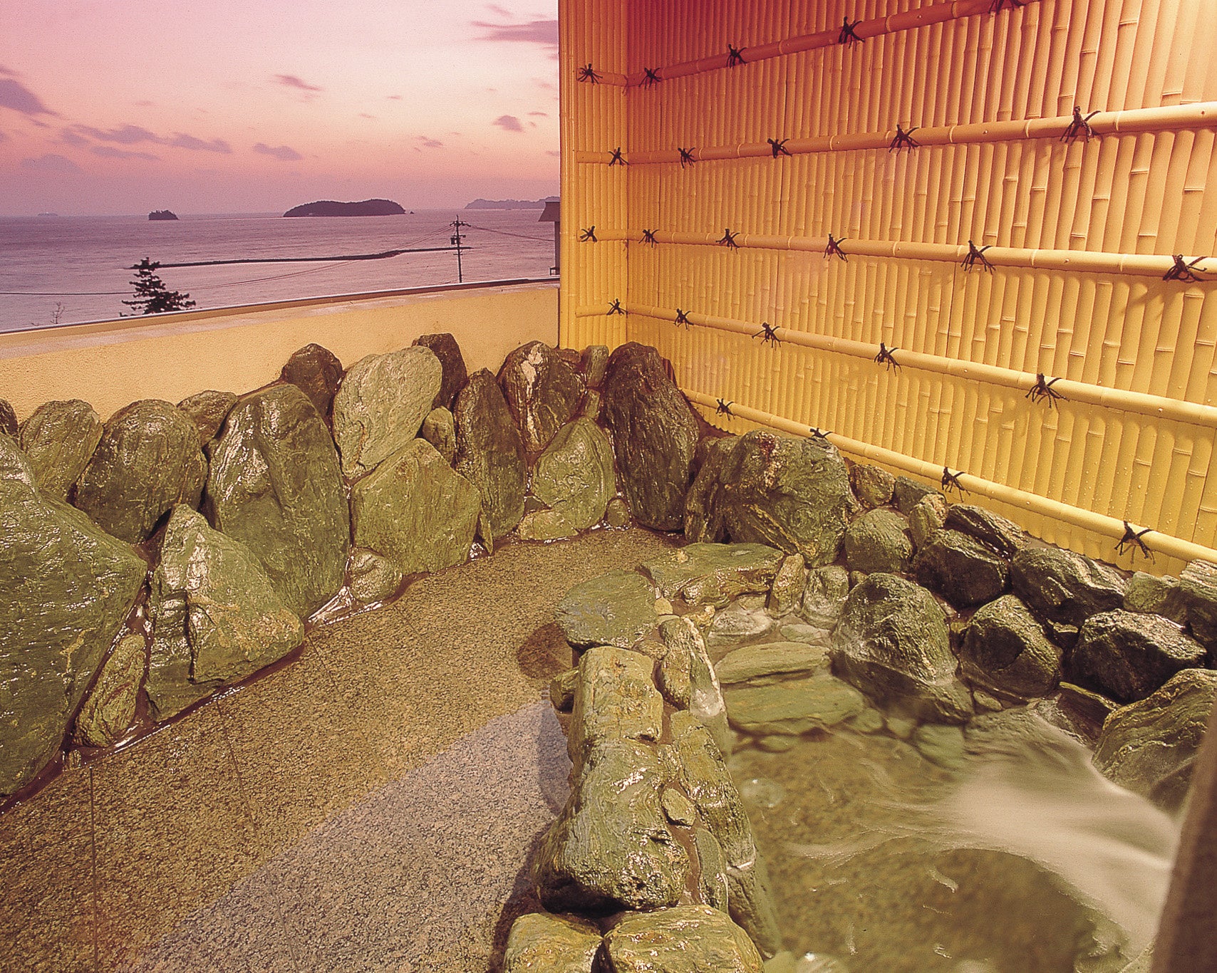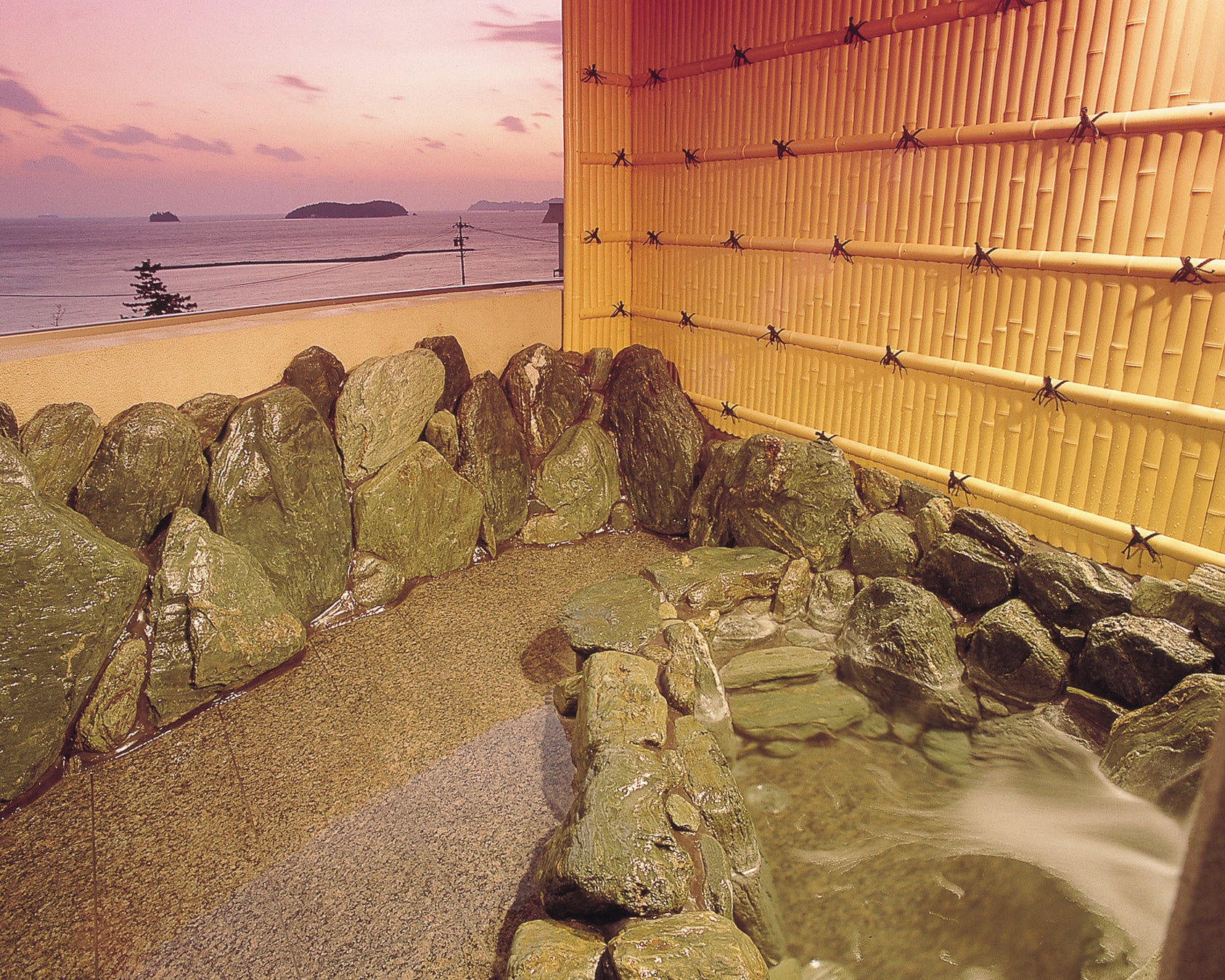 オーシャンビューの展望露天風呂で、湯けむりの先に小鳥や渥美半島の山々が織りなす絶景が広がり、朝陽・夕陽も望めます。