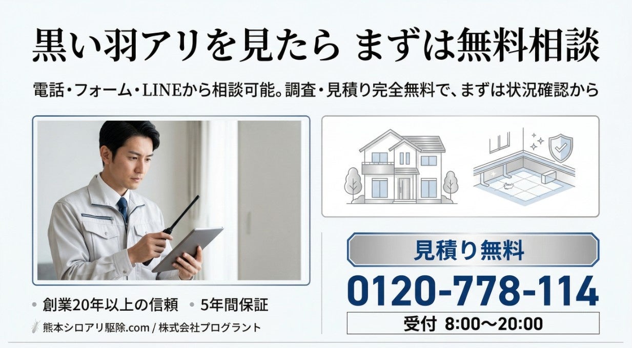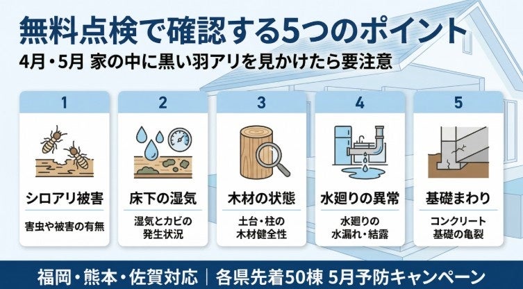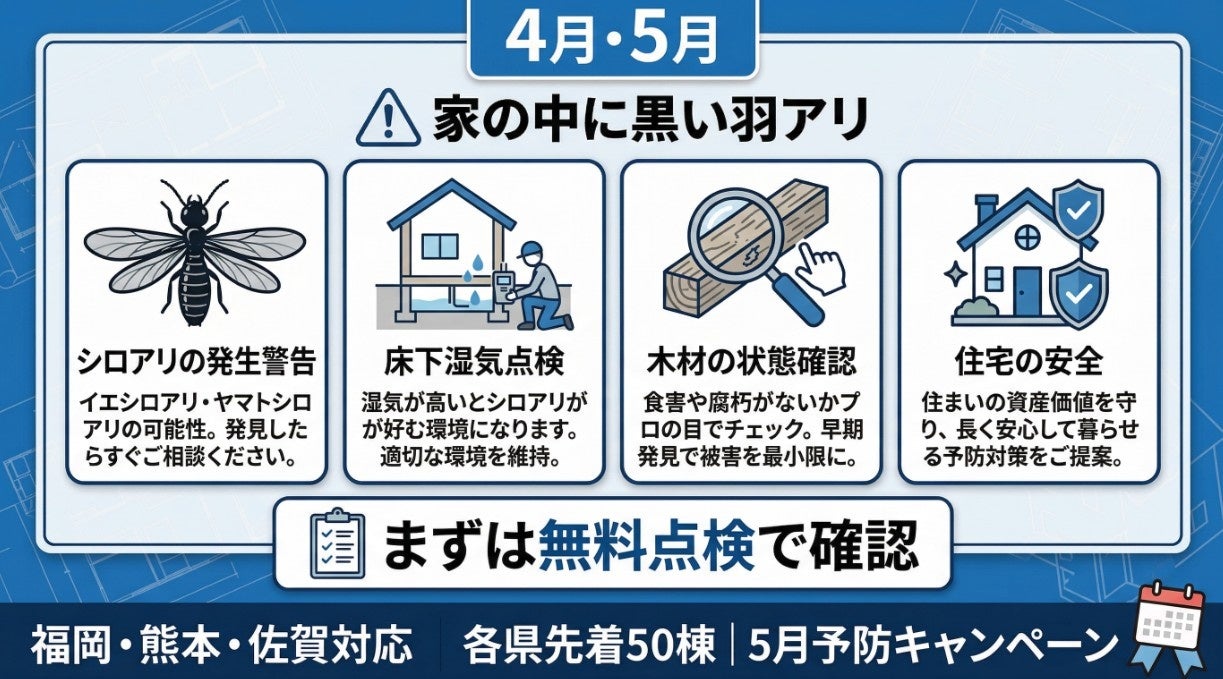 株式会社プログラント(本社:熊本県熊本市、代表取締役:藤井 靖光)は、ヤマトシロアリの羽アリが発生しやすい4月中旬〜5月に合わせ、福岡県・熊本県・佐賀県を対象に「床下SOS・無料点検」を開始いたします。