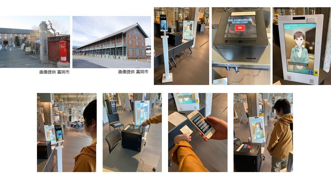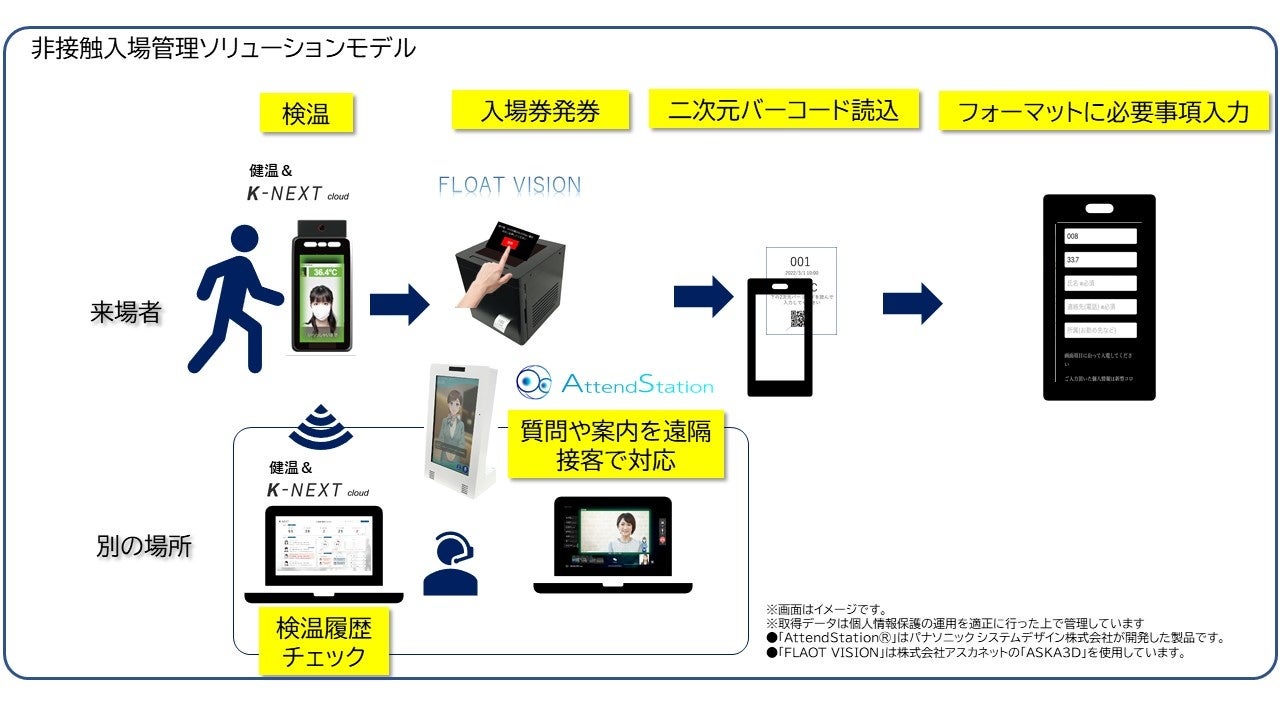 実験では、入場者が検温サイネージ「健温&K-NEXT」で検温を実施。空中結像システム「FLAOT VISION」で発券される体表面温度や二次元バーコードが記されたチケットを受け取り、券面の二次元バーコードから入場申請書にアクセスし、氏名や所属などを記入して入場する体験をして頂きました。同時に別の場所で「健温&K-NEXT」から発出される検温履歴をモニタリング、アバターで遠隔接客システム「AttendStation®」で、操作が分からないユーザーへの案内や会場案内を行う事で、ユーザーのフォローを実施しました。これらのソリューションの実現で様々な場面で重要作業の1つになっている「入場管理」において「入場者・従業員双方の非接触化」「従業員側の性別、年齢、場所を問わず簡単かつ的確な受付作業ができる」といった効果を実現します。