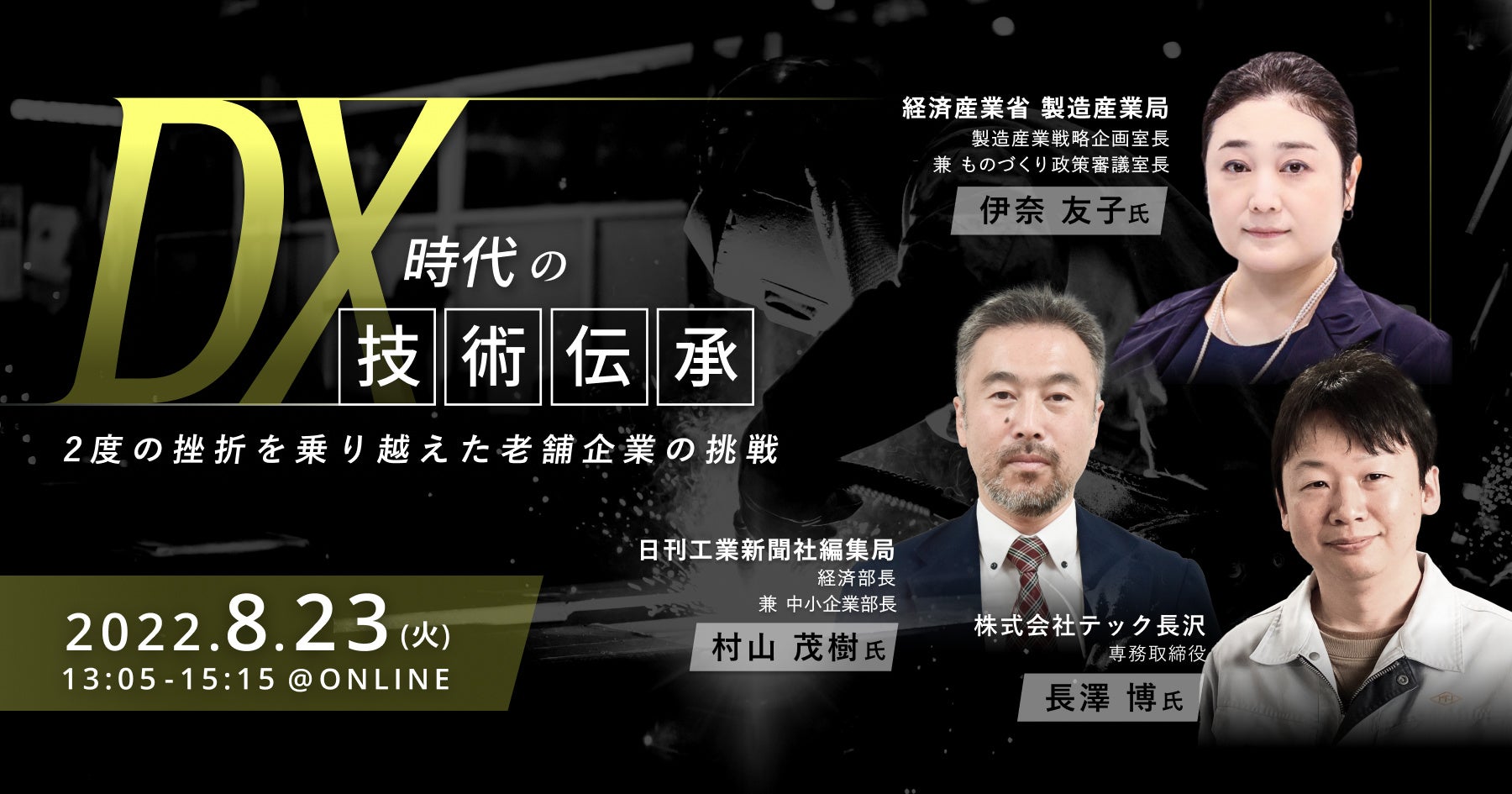 本イベントは、DXに取り組む中堅・中小企業等のモデルケースとして、経済産業省によるDXセレクション2022にて優良事例に選定された金属部品の総合メーカーである株式会社テック長沢から専務取締役である長澤 博氏をお招きし、製造現場の技術伝承への取り組みについて語っていただくほか、「ものづくり白書2022」の作成に携わっている経済産業省より、様々なデータから製造業を取り巻く現状についてお話しいただきます。本カンファレンスは、事前登録にて無料でご参加いただけます。