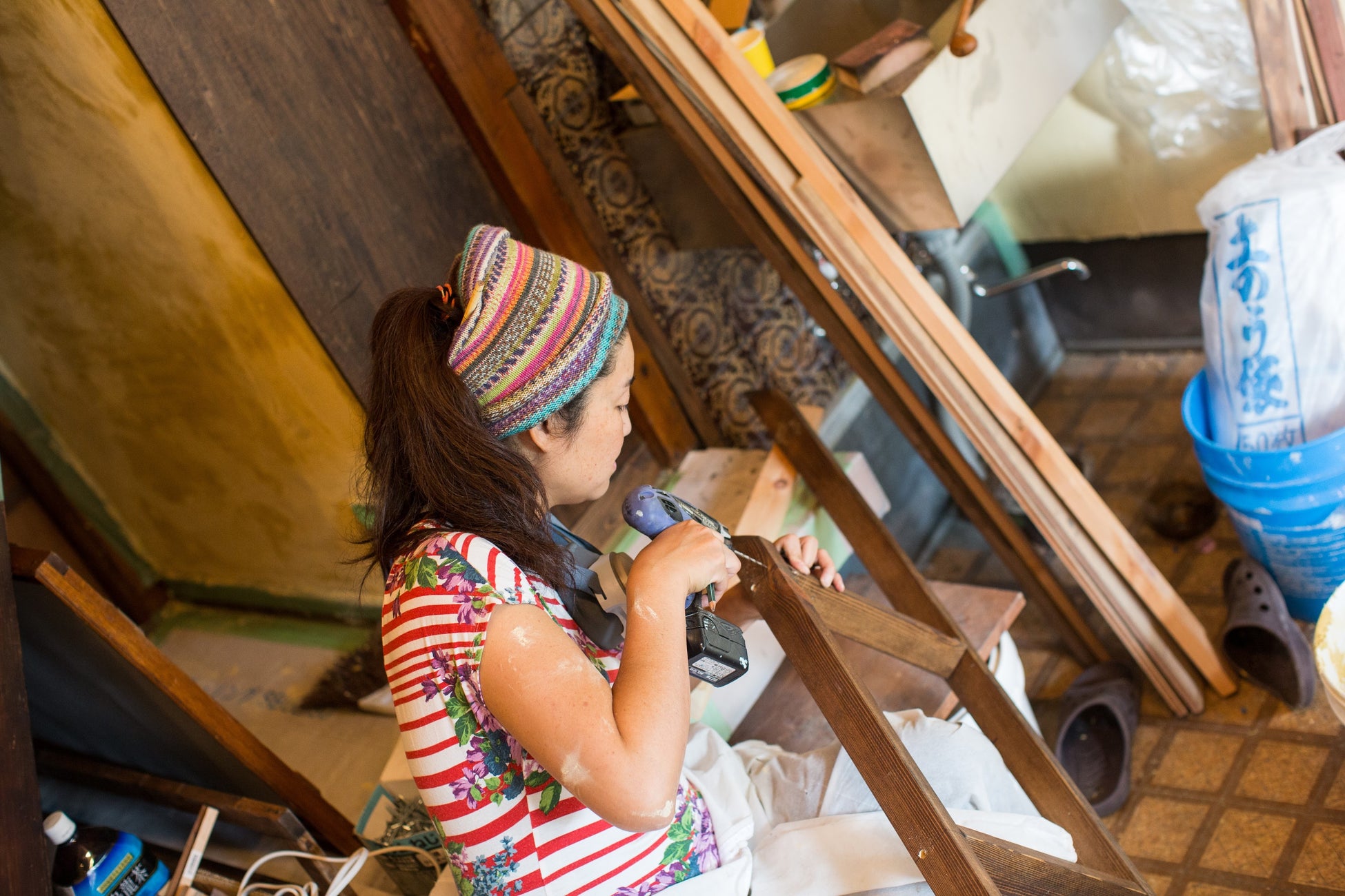 宿として再生するにあたり、物件がもつストーリーを受け継ぎたいと考えた私たちは、物件のオーナーに建物の歴史や現在までの経緯などをお聞きししました。また、建物の改修については梁や建具、階段や残されていた備品などを活かす形にし、近隣に工房を構えるDIYアドバイザー・リメイク作家の玉井香織さんの元、自分たちでDIYすることに。結果的に、毎日改修する姿を見た近隣住民の方々が自らDIYへの協力を名乗り出てくれるなど、地域の方々と一緒に協力しながら宿をつくる、というプロジェクトのような形に。