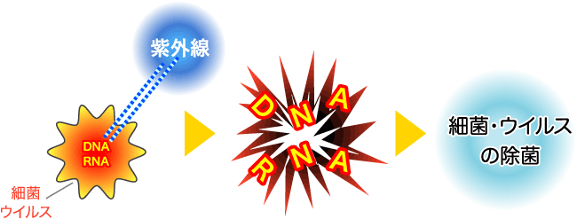 細菌やウイルスを除去するメカニズムは、細菌やウイルスが持つ遺伝子(DNAやRNA)の光の吸収スペクトルと、紫外線(UV)ランプが発するスペクトルが類似しているため細菌やウイルスに紫外線を照射すると、遺伝子(DNAやRNA)が光化学反応し、増殖機能を失うものです。