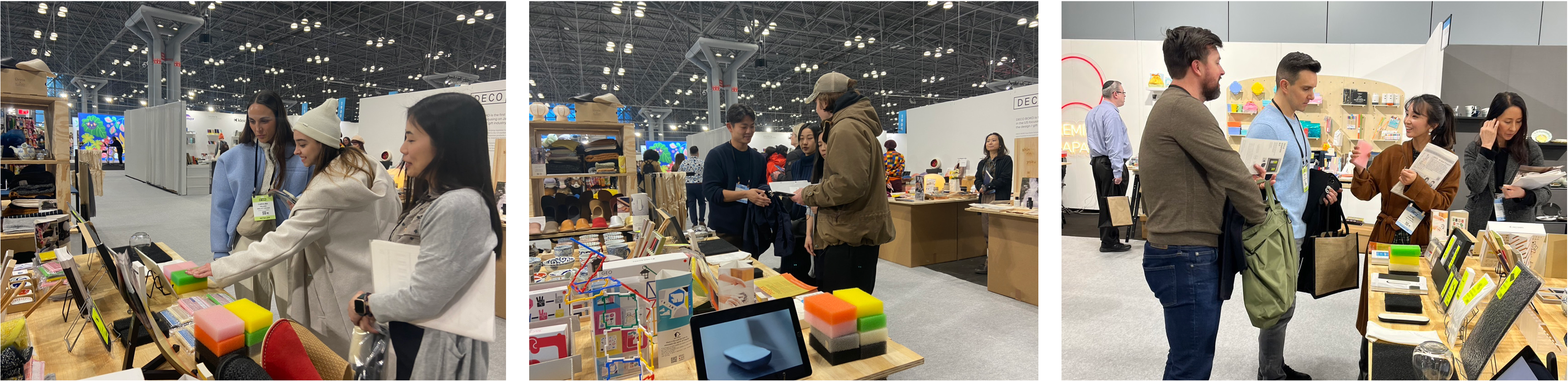 アメリカ国内の小売店や大手リテールショップ、ヨーロッパ、アジアの小売店やミュージアムショップのバイヤーが多い中でも、サンサンスポンジは特にトレンドに左右されずストーリー性の高い商材・トラディショナルな商品を探しているバイヤーや、機能性・実用性・パッケージの見た目等を併せ持った新しい商品を探しているバイヤーからの注目を集め、「カラーバリエーションがビビットでかわいい」「圧縮で届くアイデアが新しい」「触っただけでアメリカの物とは違って丈夫ということが分かる」といった評価をいただきました。固形洗剤「サンセブン®ハイアール」はアメリカの洗剤による手荒れに悩むバイヤーに興味を持って頂いた他、TEILEは男性バイヤーから「パッケージがクール」などデザイン性に対する評価をいただきました。