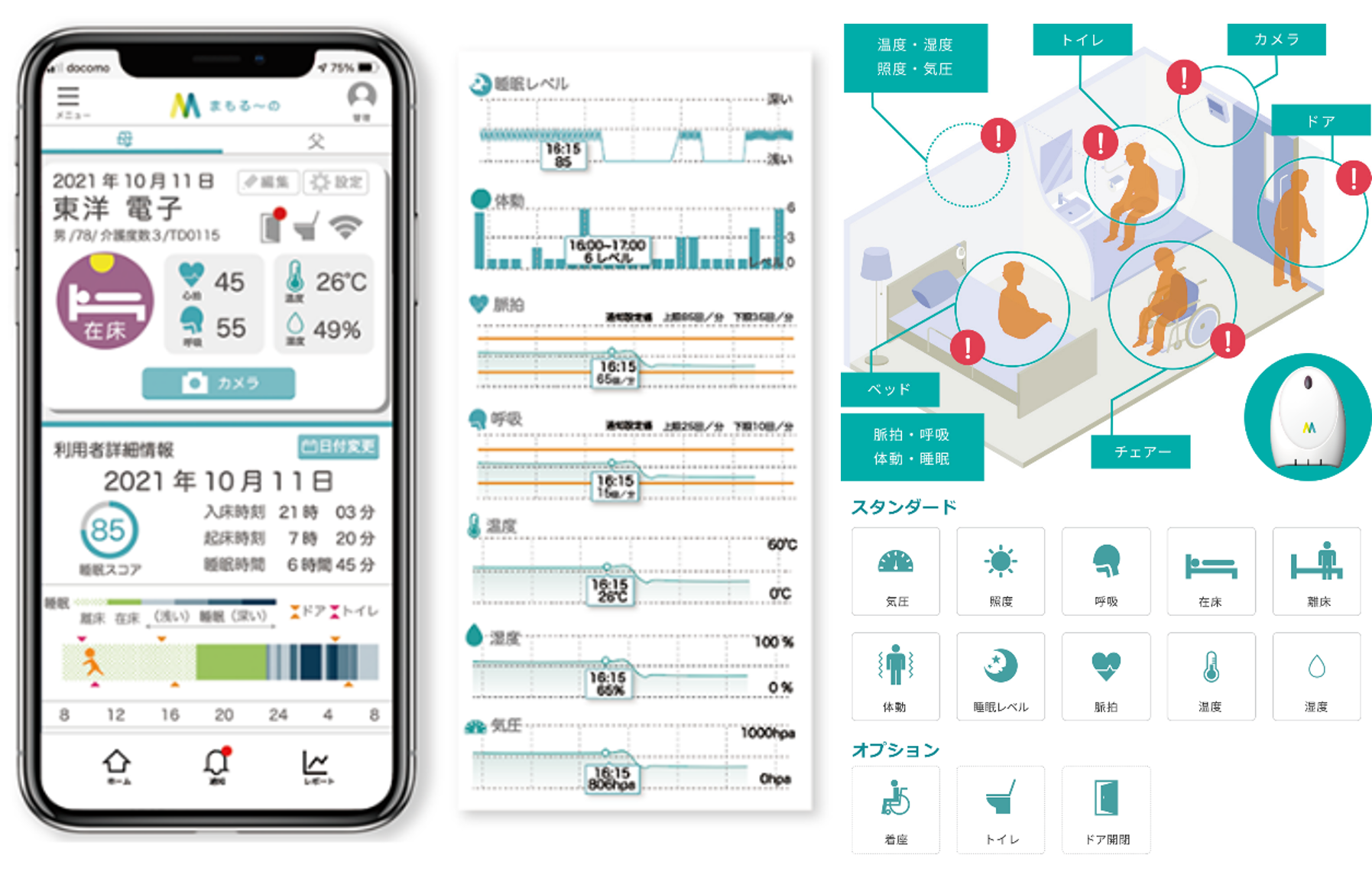 『まもる~の』は、離れて住む家族の不安や、老老介護による不安を少しでも軽減するため、在宅介護における見守りの課題を解決する介護ロボットです。