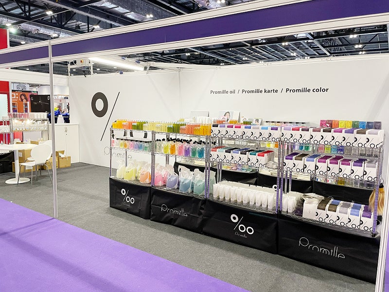 ブースでは、主力ブランドである【Promille】の人気商品「プロミルオイル」をはじめとして同ブランドのシャンプー、トリートメント、ヘアカラーなどを展示いたしました。