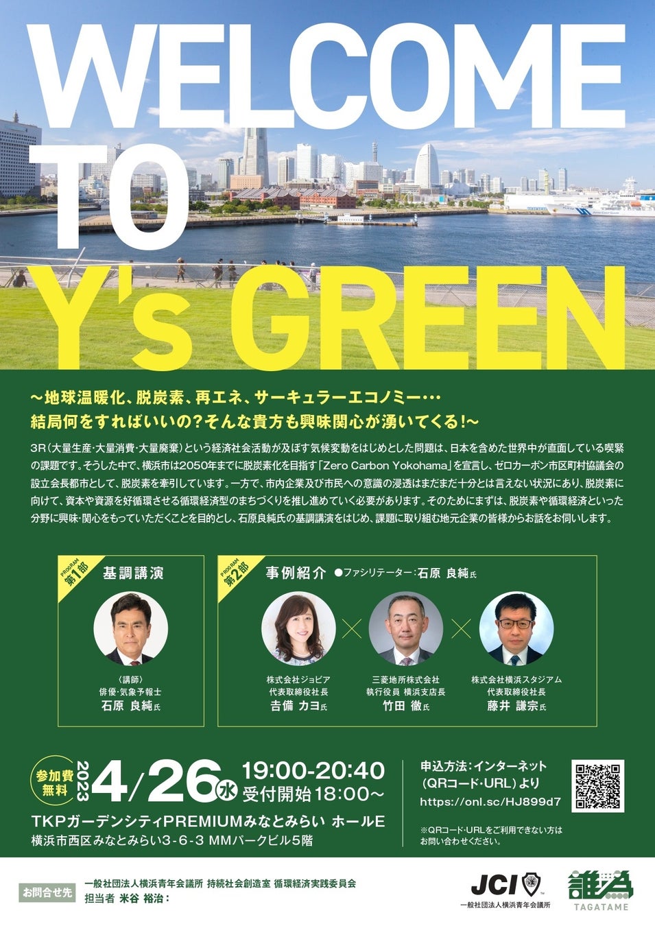 私たち一般社団法人横浜青年会議所は、明るい豊かな社会を築き上げることを理念に掲げ、社会課題解決に向けて行政等と連携しながら日々活動をしております。「Welcome to Y’s Green」は、横浜市の掲げる Zero Carbon Yokohamaの実現に向けて、資本、資源を好循環させる循環経済を推進する事業であり、知らなかった、取り組んでこなかった企業、個人に対し、石原良純氏による基調講演や企業で取り組まれている方をお招きし、実践事例についてお話しをいただき、 脱炭素及び循環経済について学べるイベントとなります。