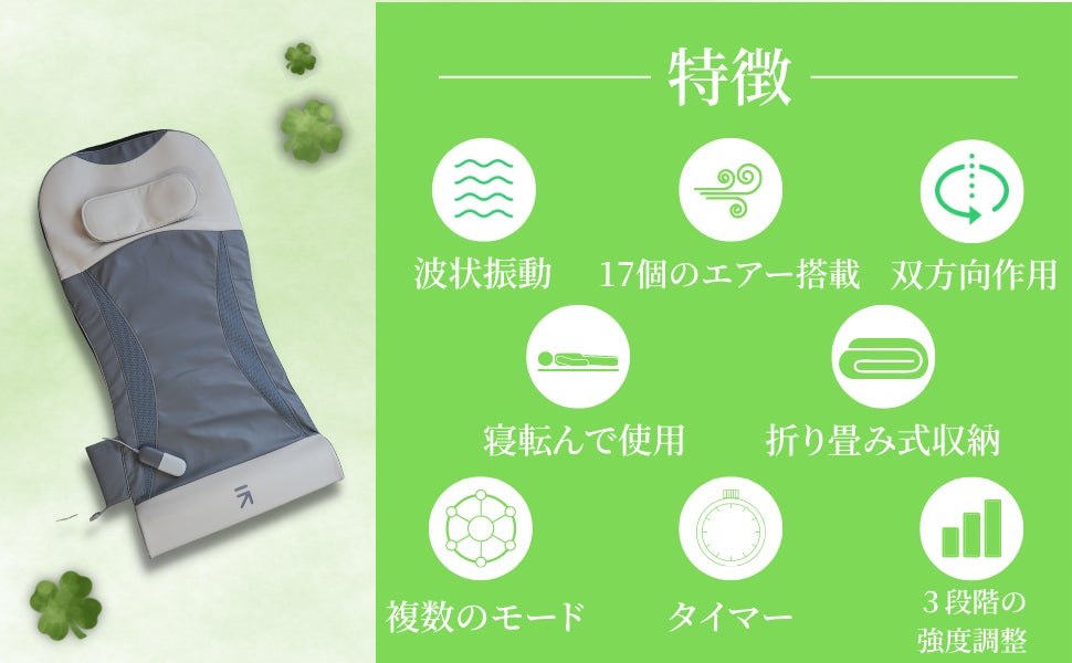 仕事が終わった後の腰や首の疲れ、家事が終わった後の肩や首の疲れ。多機能リラクゼーションシートがあるだけで、横になることで筋肉やあらゆる部位にアプローチしてくれます。17個のエアーバック搭載で体の隅々までリラクゼーションをお届け! まるで人の施術のようなアプローチを行えます。薄型なのに本格的な製品です。