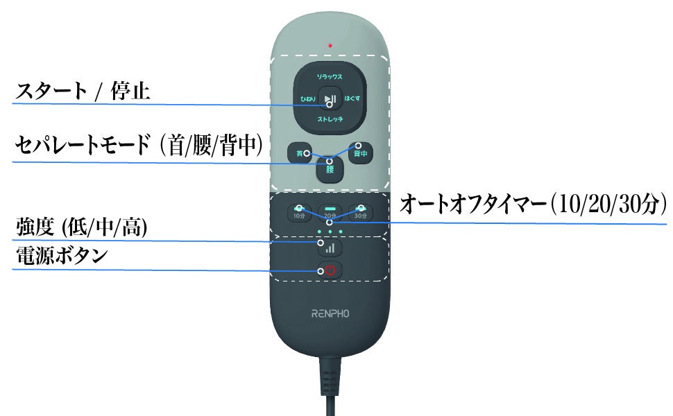 付属のリモコンには4つの動作モードを搭載、更に首・腰・背中と任意の部分を集中的にアプローチする事も可能です。稼働時間も10分・20分・30分と選択が可能で、安心してリラックスできます。