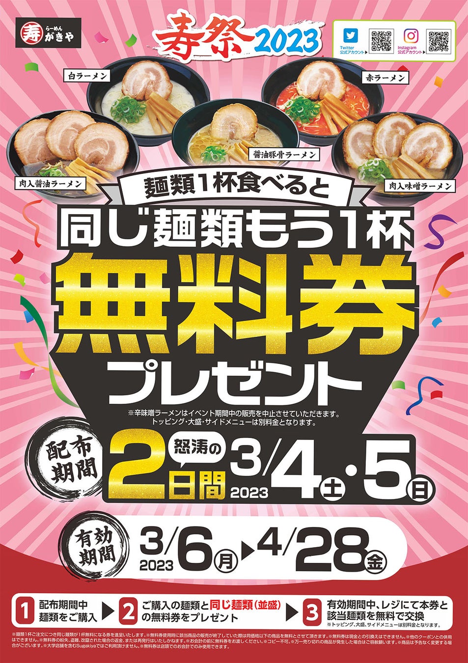 このような状況下ではありますが、日頃よりスガキヤをご愛顧いただいている皆様へ感謝をお伝えすべく、この3月にスガキヤ店舗で5年振りとなる「半額祭(スーちゃん祭2023 ※2)」を開催させて頂きます。皆様のご来店を心よりお待ちしております。