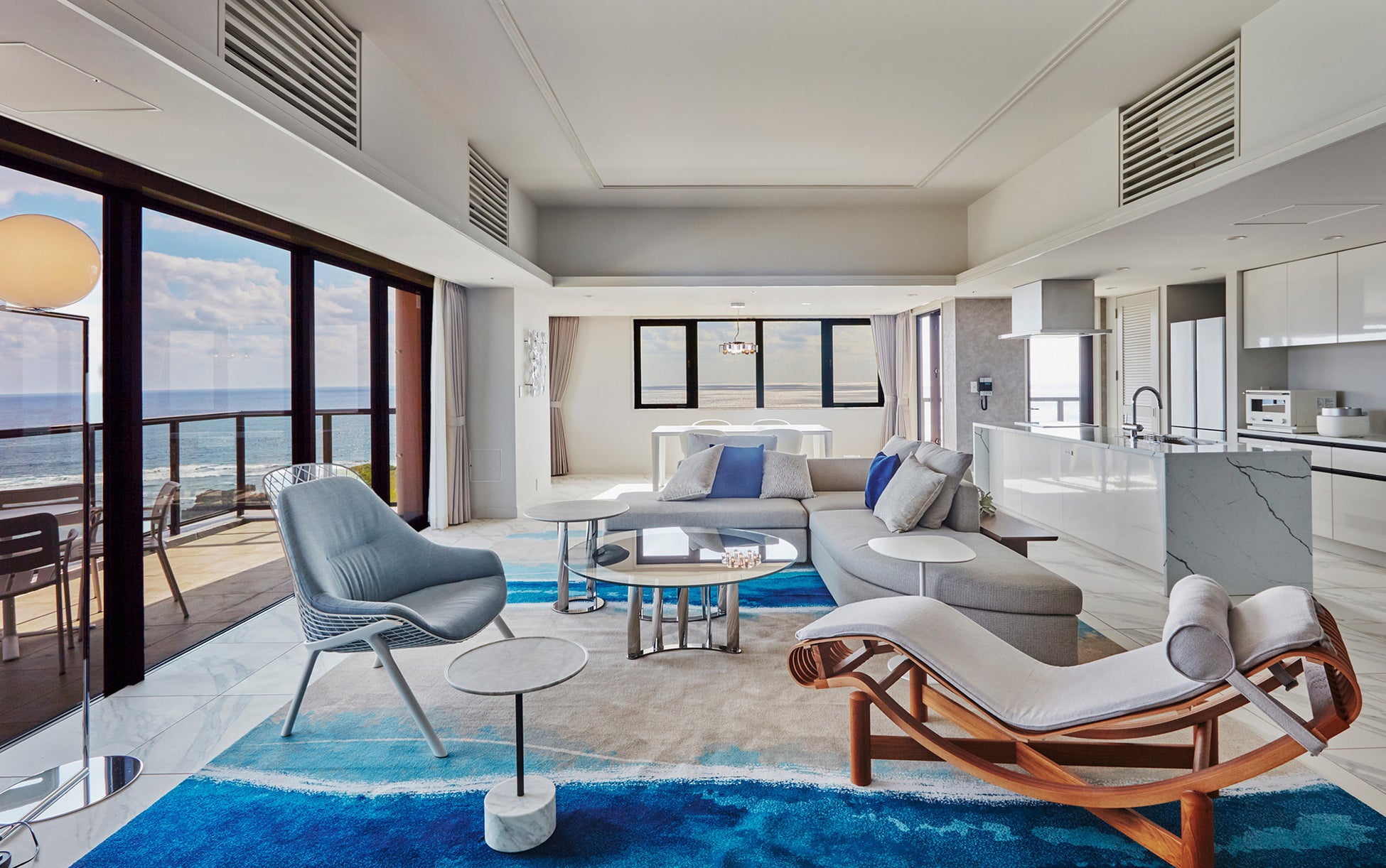 客室は、邸宅で暮らすような滞在をコンセプトに〈グランドプレミアフロア〉〈プレミアフロア〉〈デラックスフロア〉の3つのフロアタイプをご用意。「カッシーナ・イクスシー」監修の家具を中心に、白砂と紺碧をモチーフに仕立てたアーバンモダンなインテリアと共に、全室にハイグレードなキッチンとリビングダイニングを配置するなど、住まいとしてのファシリティを充実させております。