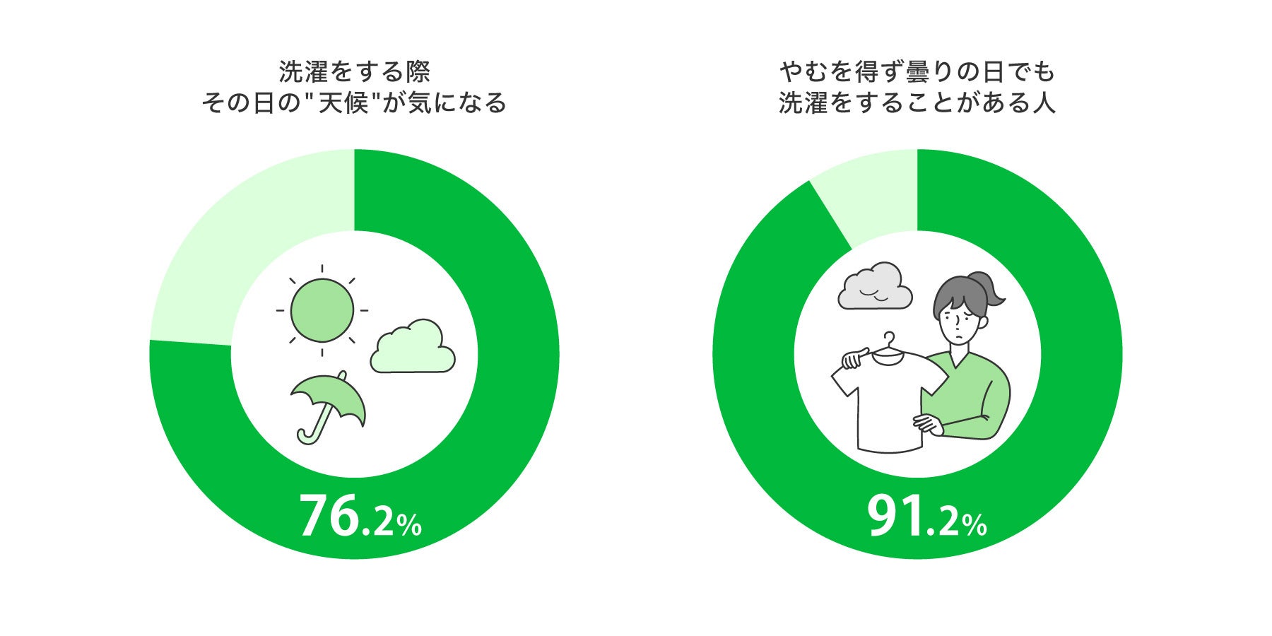 - 約75%以上の女性が、「洗濯をする際、その日の"天候"が気になる」と回答。仕上がりに悪影響とわかっていても、やむを得ず、曇りの日でも洗濯をすることがある人は90%以上