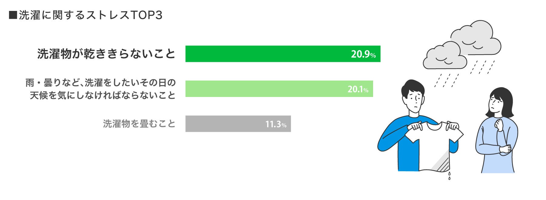 洗濯に関するストレスに関して、あてはまることを質問したところ、「洗濯物が乾ききらないこと(20.9%)」が一番多く、次いで「雨・曇りなど、洗濯をしたいその日の天候を気にしなければならないこと(20.1%)」、「洗濯物を畳むこと(11.3%)」という結果となりました。