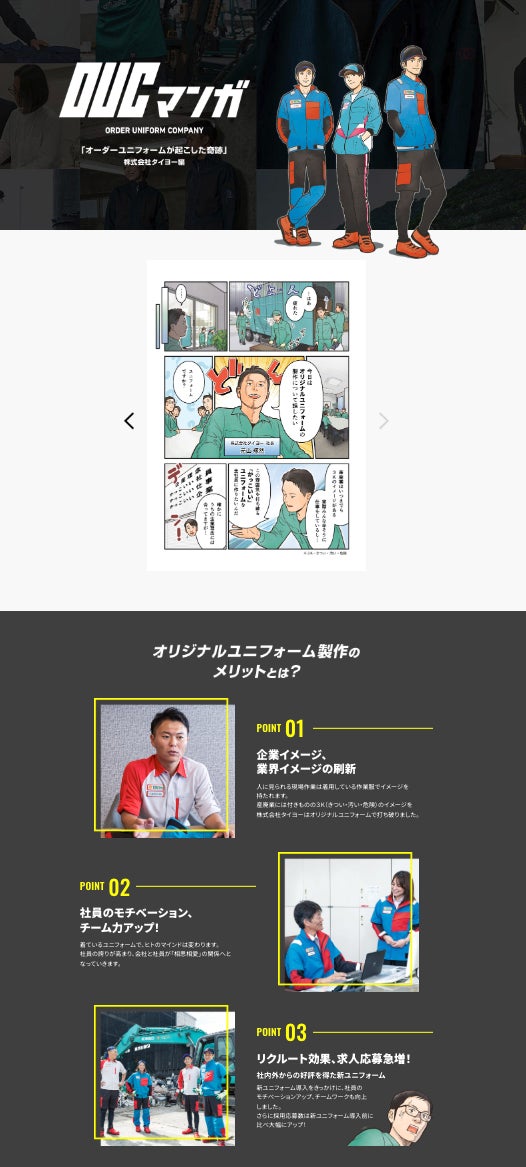 オリジナルユニフォームは従業員の働きやすさや、企業イメージを向上できる可能性を秘めています。現在まで500社を超えるお客様に納品しており、お客様からの評判も良く、特に企業イメージ向上の一役を担っております。そのオリジナルユニフォームの魅力を幅広い方に伝えるため、オリジナルユニフォーム導入のきっかけから、納品後のストーリーを分かりやすくマンガで再現した「OUCマンガ」を立ち上げました。