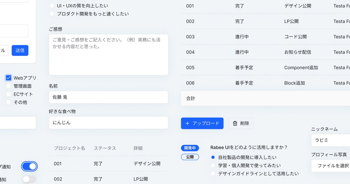 Rabee UIは、ただのUIコンポーネント集ではなく、デザインと実装の連携によってプロダクト開発を加速させるツールです。たとえば、管理画面やLPの制作など、品質の高いUIをスピーディーに開発したいシーンで大きな効果を発揮します。