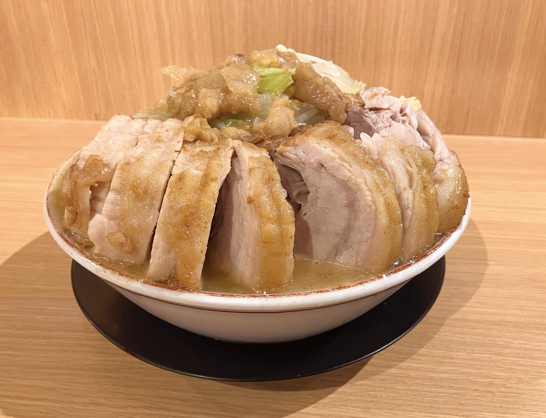 見た目も食べ応えも満足の一杯。甘みのある醤油ダレを加えた力強い豚骨スープに、じっくり煮込んだトロトロぶたが何と8枚も!丼を覆い尽くすたっぷり野菜の大ラーメンは、麺が375gのガッツリ系。野菜や背脂マシマシなどのトッピング変更もできます。
