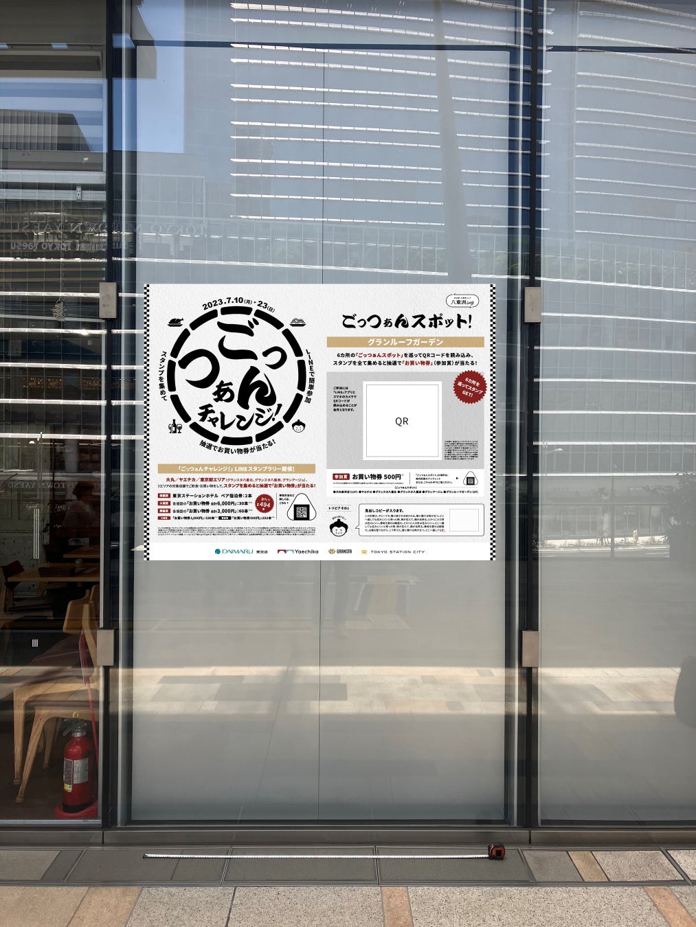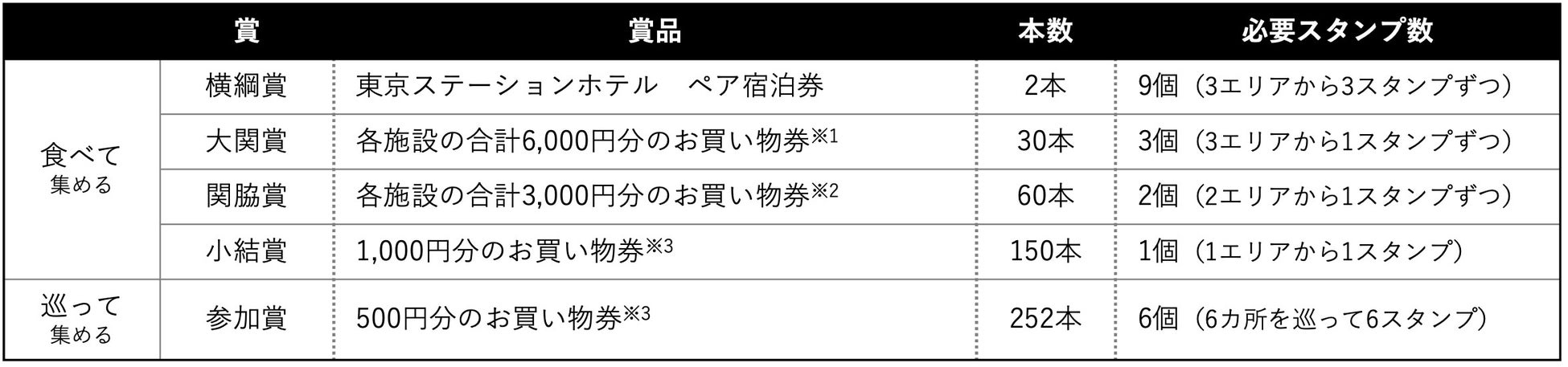大丸・ヤエチカ・東京駅(グランスタ八重北・グランスタ八重洲・グランアージュ)の対象店舗でのご飲食やお買い物でスタンプを集めると、抽選で宿泊券やお買い物券が当たります。または、エリア内にある6カ所の「ごっつぁんスポット」全てのスタンプを集めると抽選で「参加賞」が当たります。