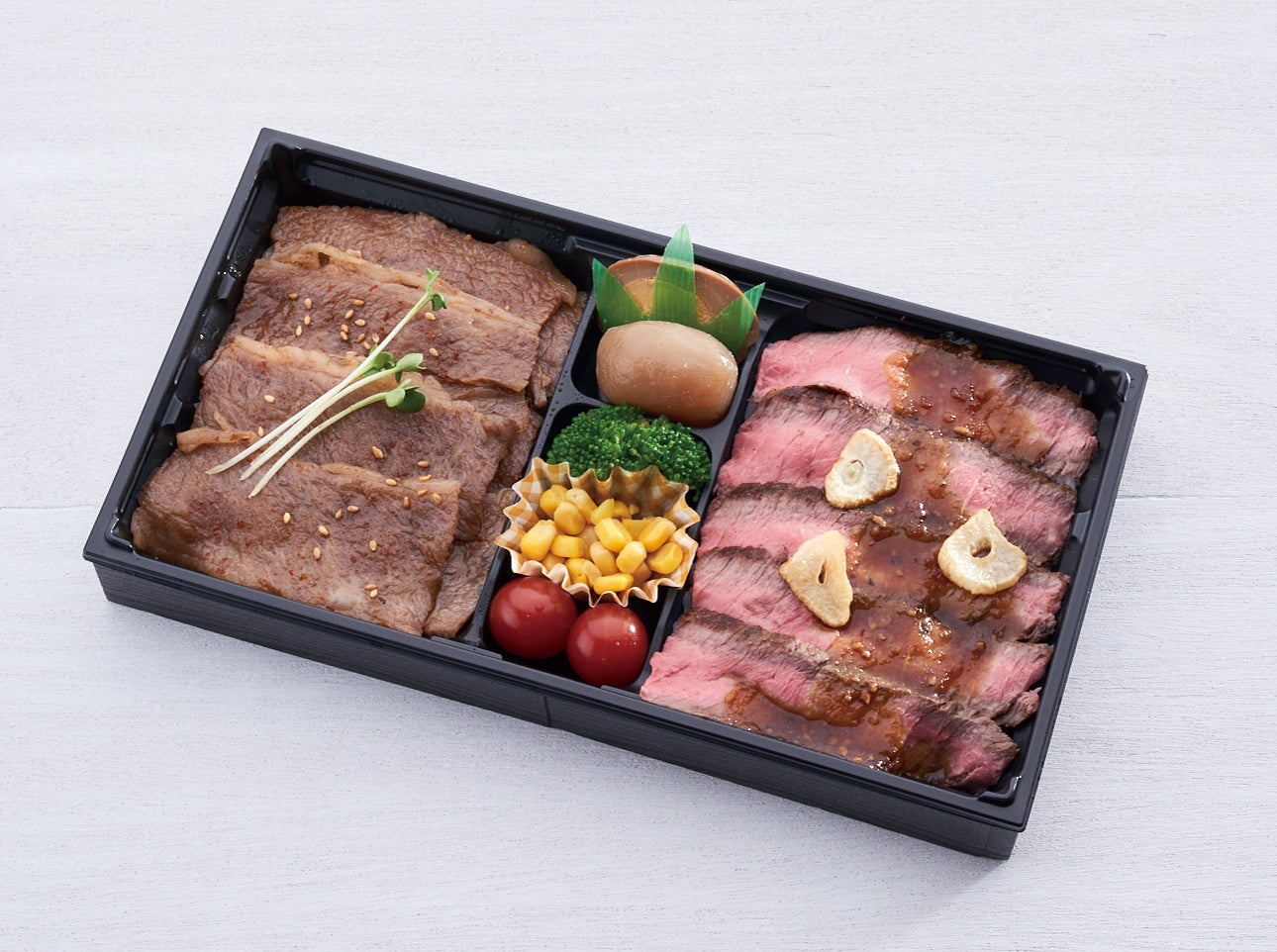 焼肉×ステーキの肉ずくし弁当。すべて米沢牛を使用し、焼肉は豆板醤でピリッと辛く、ステーキはニンニク味に仕上げ、特盛りにした「お肉たっぷりで食欲マシマシのお弁当」です。