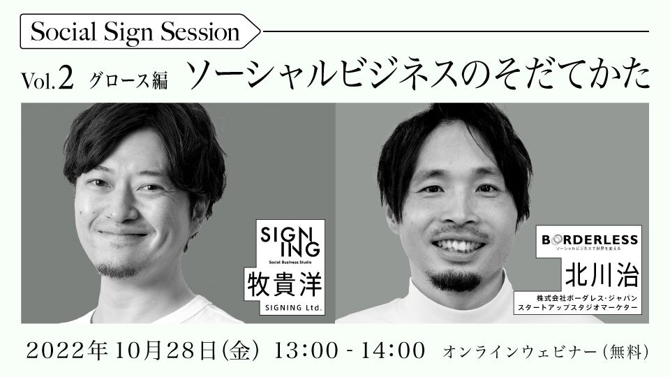 株式会社SIGNING主催の全3回ウェビナー。社会課題解決に取り組む社会企業家集団・株式会社ボーダレス・ジャパンとのコラボ企画です。
