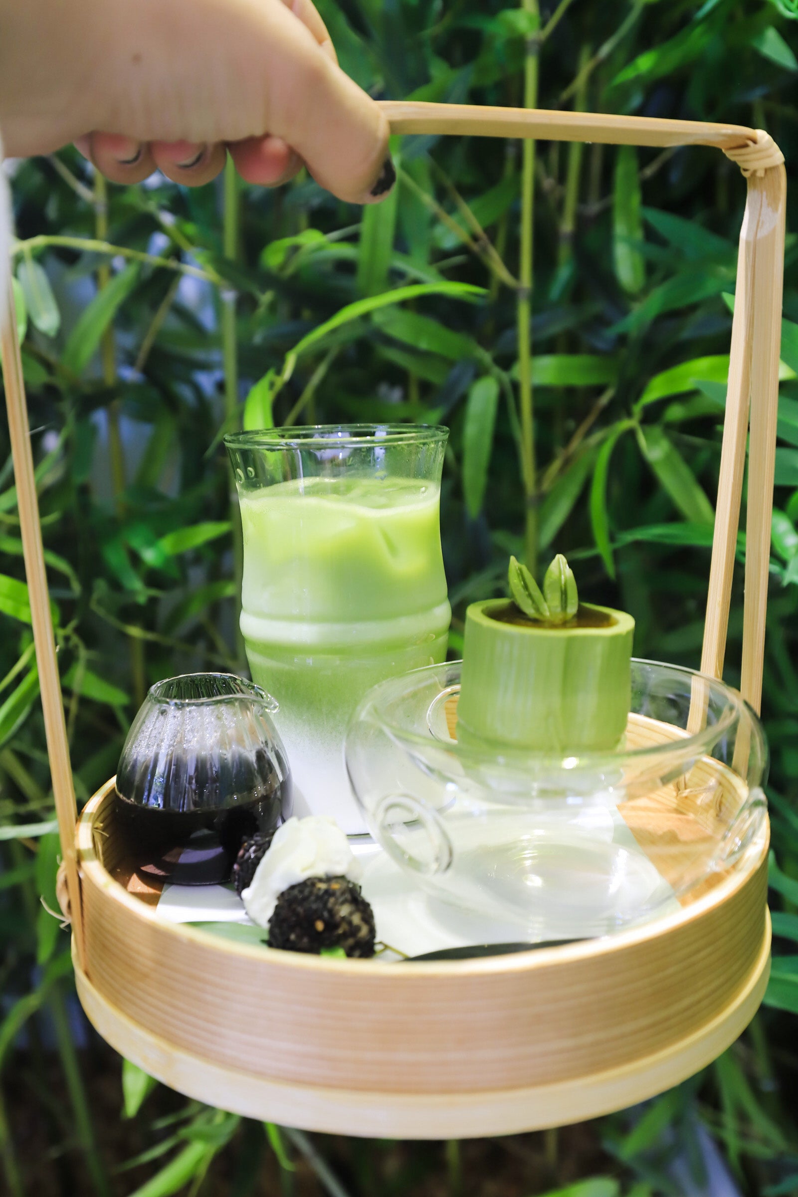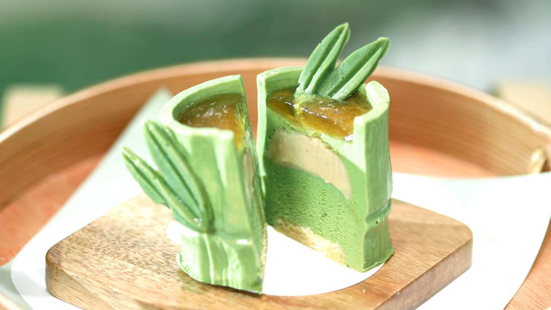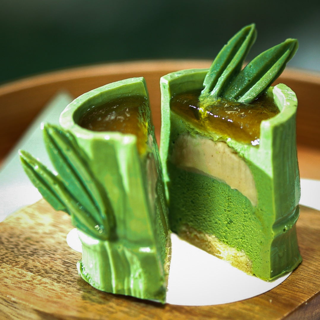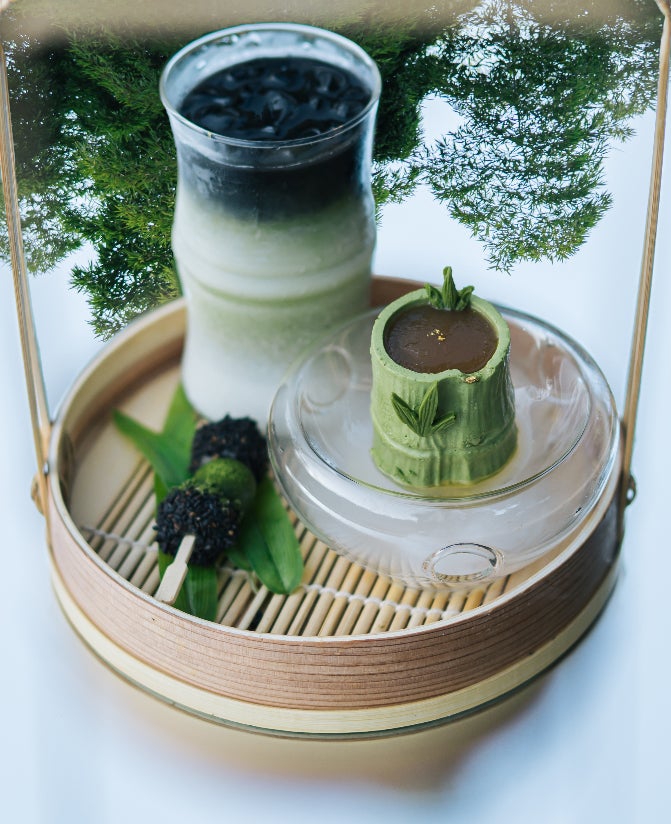 抹茶味の竹のムースケーキ、表面に黒糖のジュレを乗せた丸ごと食べれるスイーツ、滑らかな口当たり、つるんとした食感。抹茶ラテは上品な苦みのある抹茶の風味にミルクの優しい甘さが加わったまろやかなハーモニー、竹炭シロップ入れる事で奥行きのある味わいに。