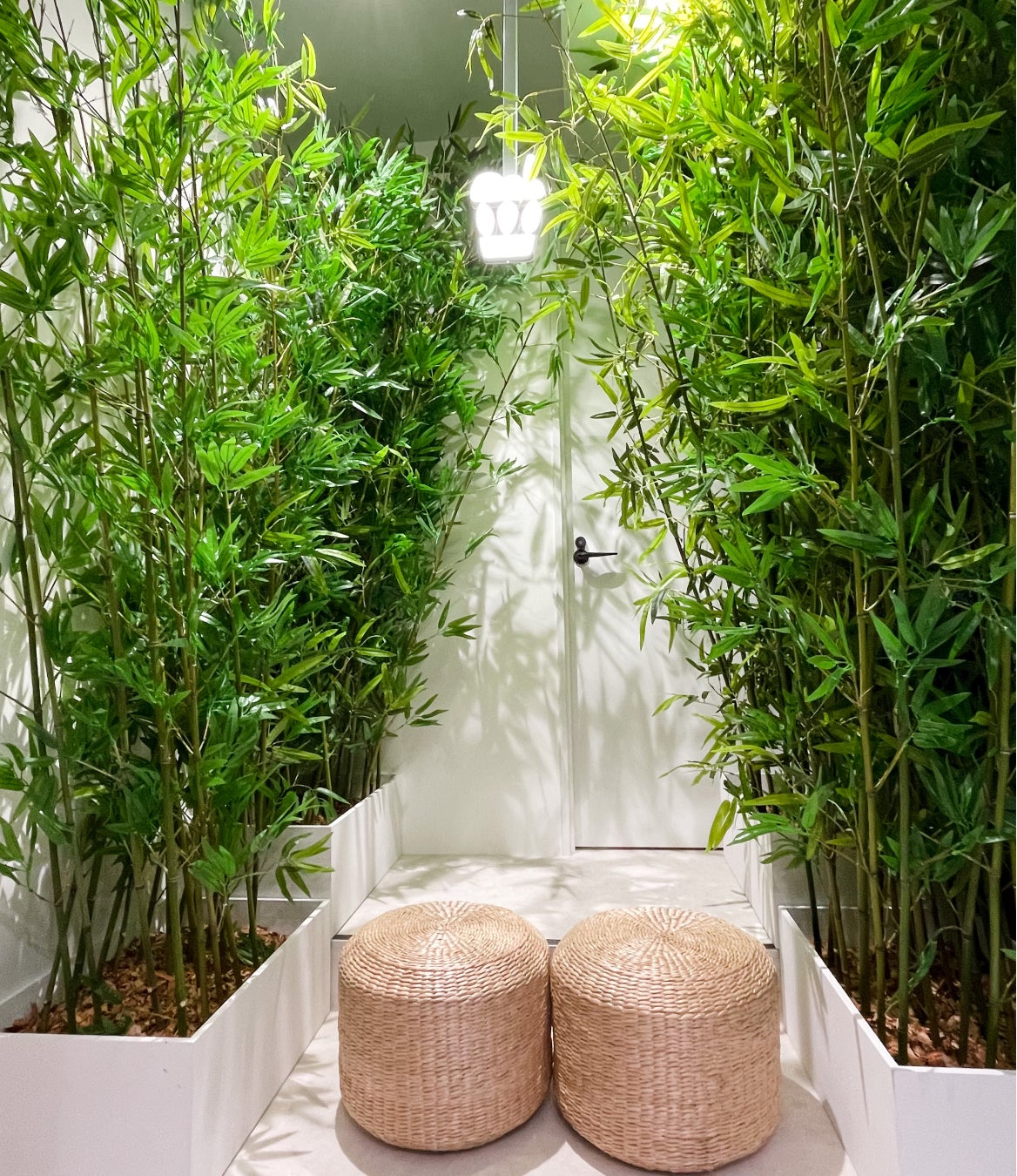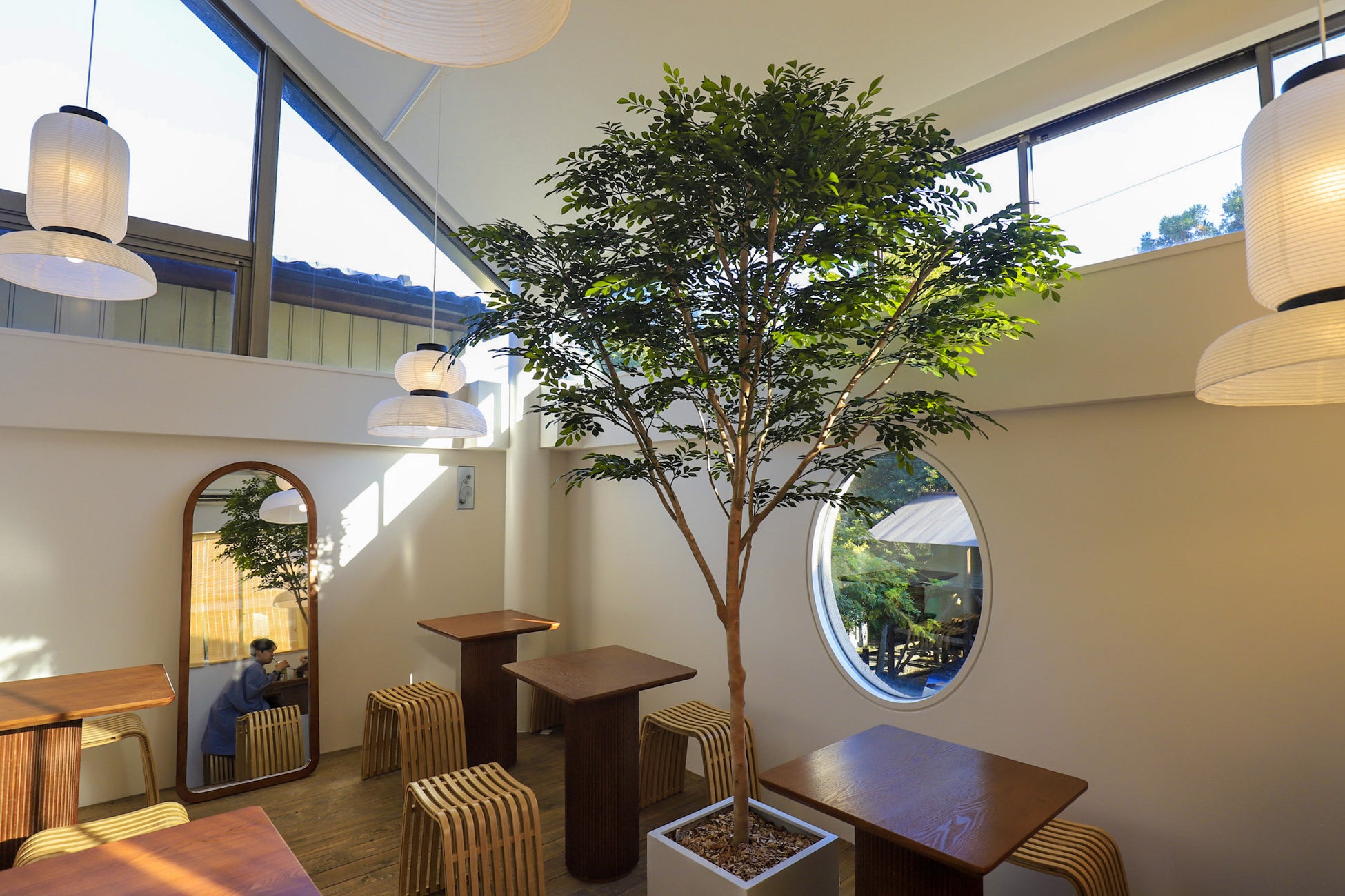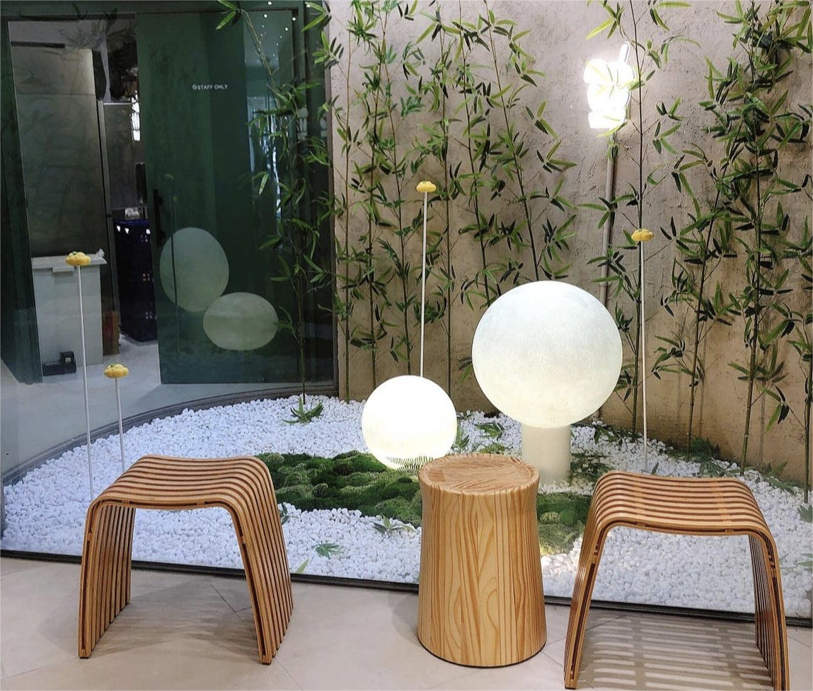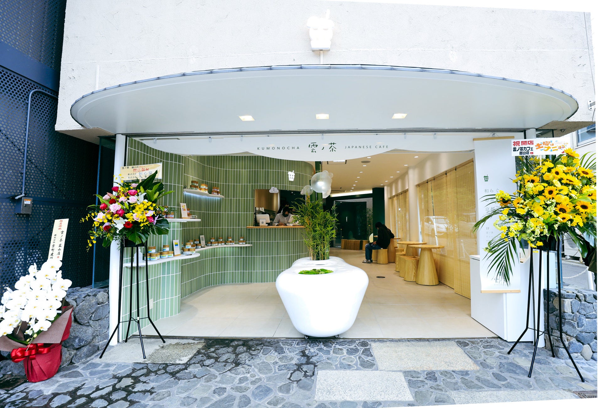 との興味をそそられるながらも、モダンな軽やかさを組み合わせた特別な空間。店舗の内装は嵐山とマッチし、京都原産の竹を使用しており、店舗全体は代表的な竹の色を基調としています。 「緑」をテーマカラーに、白は雲、黒は嵐山をイメージ。特に2階は竹を使って「嵐山竹林道」を再現しています。