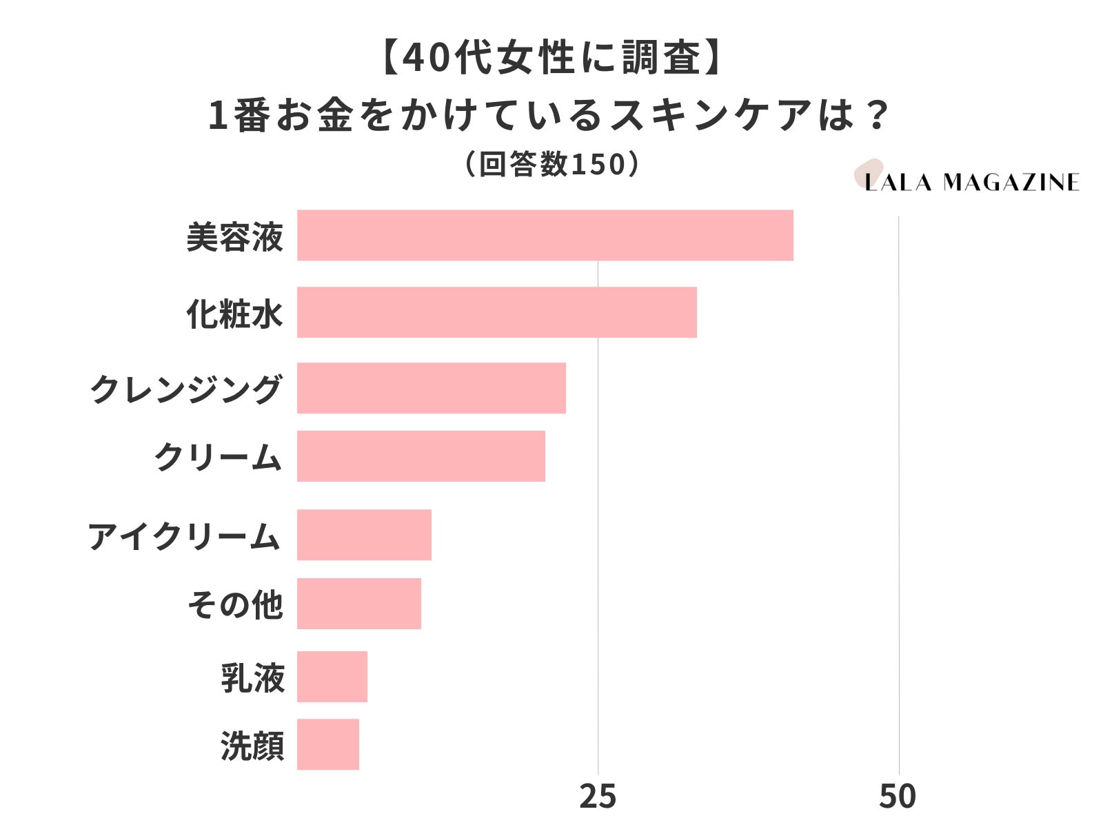 40代女性がスキンケアでお金をかけているのは「美容液」が全体の30%となりました。